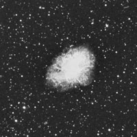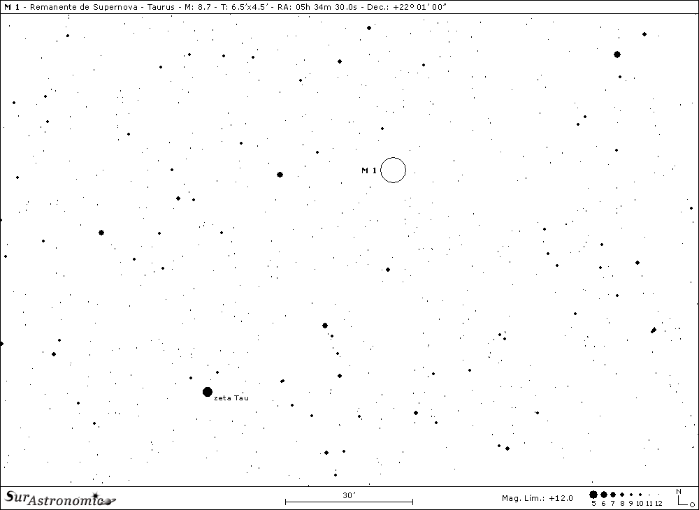 Ahora nos movemos unos 7° con dirección Sur y algo al Este, cruzando nuevamente la Eclíptica, donde hallaremos a M 1, la conocida Nebulosa del Cangrejo, así llamada por el astrónomo irlandés William Parsons, tercer Conde de Rosse, quién, en el año 1844 fue el primero en notar su estructura filamentosa como patas de araña o cangrejo, utilizando un telescopio reflector de espéculo de 36". Este notable objeto es el resultado del estallido de una supernova, registrado principalmente por observadores chinos, japoneses y árabes, el día 4 de julio de 1054, como una nueva estrella, superior a Venus en brillo, tal vez alcanzando mag. -6, visible durante el día por 23 días y, a simple vista durante las noches, por casi dos años. Fue descubierta por el físico y astrónomo amateur inglés John Bevis, en el año 1731, con un telescopio refractor de 3" y, redescubierta por Charles Messier en el año 1758, con un telescopio similar, desconociendo la observación de J. Bevis y, dando origen a su célebre catálogo.