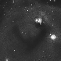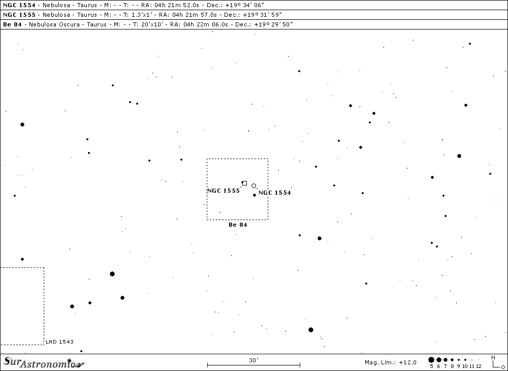 A continuación encontraremos dos curiosas nebulosidades, una atractiva y otra desvanecida, asociadas a la interesante Nube Molecular de Tauro, zona vasta, cercana y densa de gas y polvo interestelar, rica en moléculas, todo el material fundamental para la formación estelar. NGC 1555 es una nebulosa de reflexión variable, iluminada por la muy joven e interesante estrella variable irregular y múltiple, T Tauri. La nebulosa, conocida como Hind’s Variable Nebula, fue descubierta en 1852, por el astrónomo inglés John Russell Hind, un gran descubridor de asteroides y estrellas variables. La nebulosa, junto a las estrellas asociadas, se encuentra a unos 460 años luz de nosotros, tiene un tamaño aparente de 1,3’x1’ y un A.P. de 12°. Para hallarla debemos identificar a su estrella asociada, ubicándola muy cerca de las Híades, a 1,4° al Oeste-Noroeste de la estrella amarillo-anaranjada, de mag. 3,5, epsilon (ε) Tauri.