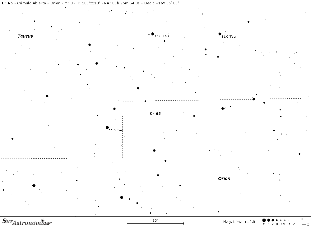 Siguiendo hacia el Sur, observaremos a Cr 65, un joven cúmulo galáctico de gran dimensión aparente, posible parte de una asociación OB, que fue ingresado en el año 1931 por el astrónomo de origen sueco, Per Arne Collinder y, se halla centrado en la constelación de Orion, sobre el límite Sur de Taurus, compartiéndose entre ambas constelaciones, a unos 6° al Sud-Sudoeste de la joven estrella blanco-azulada de 3ª mag., zeta (ζ) Tauri.