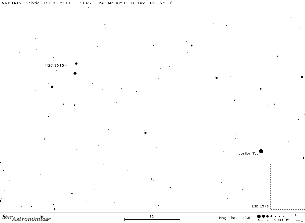 Aún en la periferia de las Híades, a 3,3° al Este y apenas al Norte de NGC 1555, encontramos otro desafío, NGC 1615, una débil galaxia espiral, clase SAO-:, descubierta con un telescopio reflector de 31,5", en el año 1878, por el astrónomo francés Jean Marie édouard Stephan, quien fuera director del Observatorio de Marsella entre los años 1867 y 1907 y, es bien conocido por el descubrimiento del grupo de cinco galaxias (cuatro de ellas en colisión), Arp 319 o Quinteto de Stephan. También hallamos esta galaxia a unos 3,5° al Norte y apenas al Este de Aldebarán y, muy cercana a tres brillantes y coloridas estrellas, formando un triángulo, al Este, de dos de ellas. Estas tres estrellas nos facilitarán la búsqueda de la galaxia, siendo: a unos 5’ al Oeste-Noroeste, SAO 94021 ó HD 29103, amarillo-pálido y de mag. 7,2; a unos 6’ al Sudoeste, la más brillante, SAO 94022 ó HD 29104, amarillo-dorada, con mag. 6,3; y la tercera, a 14’ prácticamente al Sudeste, SAO 94031 ó HD 29193, blanquecina y de mag. 7,3.