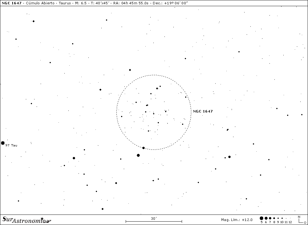 Ahora nos moveremos cerca de la periferia Este del cúmulo de las Híades, a unos 5° al Este-Noreste del centro del cúmulo ó a 3,5° al Noreste de Aldebarán, para localizar a NGC 1647, un amplio cúmulo galáctico, que se muestra interesante ya con binoculares y pequeños telescopios desde un lugar oscuro. Su mag. es debida principalmente a varias estrellas brillante que, en definitiva, no pertenecen a él. Posee unas 200 estrellas a partir de la 8ª mag., con una edad promedio de 180 millones de años, su clasificación es II 2 r y, se encuentra a una distancia de 1780 años luz, unas cuatro veces más distante que las Pléyades y unas trece veces más que las Híades. Fue descubierto por William Herschel en 1784.