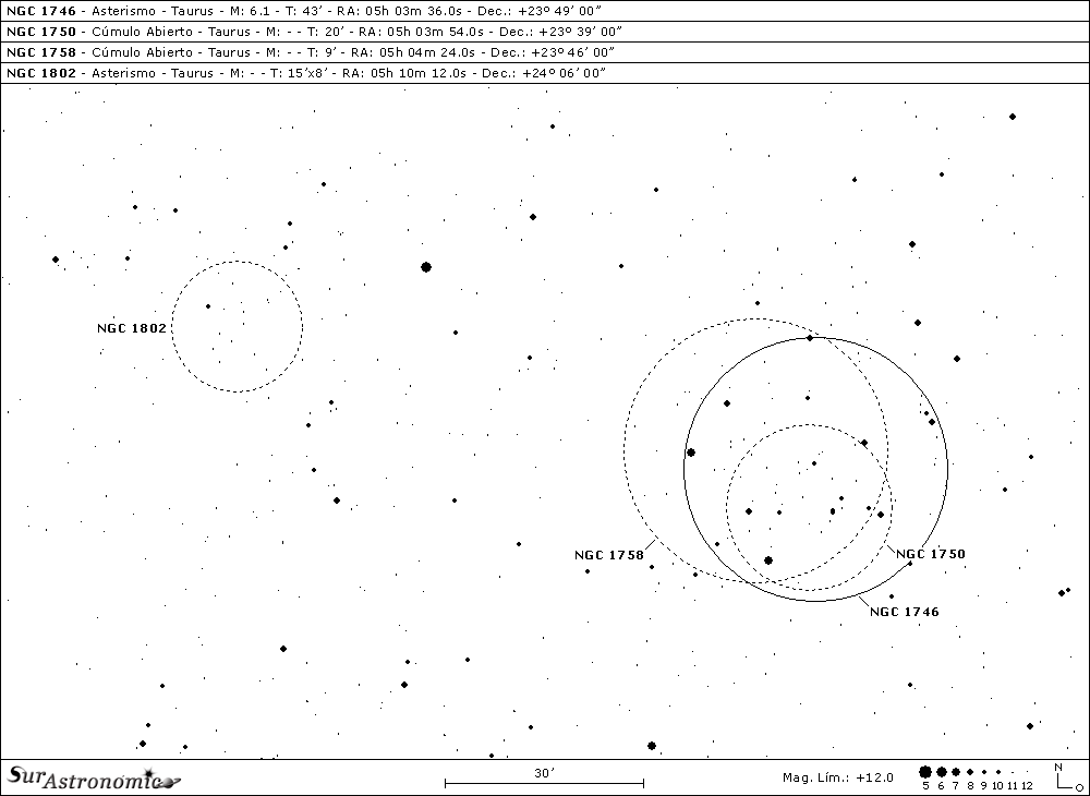 Nos movemos nuevamente, hasta casi mitad de camino entre las brillantes estrellas alfa (α) Tauri y beta (β) Tauri, más cerca, a 7° de esta última, para localizar una confusa zona estelar, ubicada muy cerca de la compleja e interesante zona de la Nube Molecular de Tauro, fue estudiada, en el año 1785, por el gran astrónomo de origen alemán, William Herschel y derivó en su descubrimiento de NGC 1750 y NGC 1758. Allí mismo, unos veinte años antes, en 1863, Heinrich Louis d’Arrest, también de origen alemán, registró a NGC 1746. Estos objetos fueron incorporados como tres cúmulos estelares abiertos o galácticos, pero en realidad, uno de ellos no lo es. Luego de varios años de investigación y discusión, sobre si estos tres cuerpos tenían una posible conexión física, hoy se cree que entre NGC 1750 y NGC 1758 no existe relación física, siendo ambos verdaderos cúmulos galácticos superpuestos y, que NGC 1746, hasta hace unas décadas el principal cúmulo del área, no es un cúmulo real, es un asterismo, compuesto en parte por estrellas de los otros dos objetos. En definitiva, tenemos aquí juntos, sobre un área con un diámetro de unos 43’ de arco, como el tamaño de una Luna llena y media, tres objetos para observar con prismáticos, donde se apreciarán varias estrellas resueltas sobre un tenue fondo nebuloso y, pequeñas y grandes aperturas.