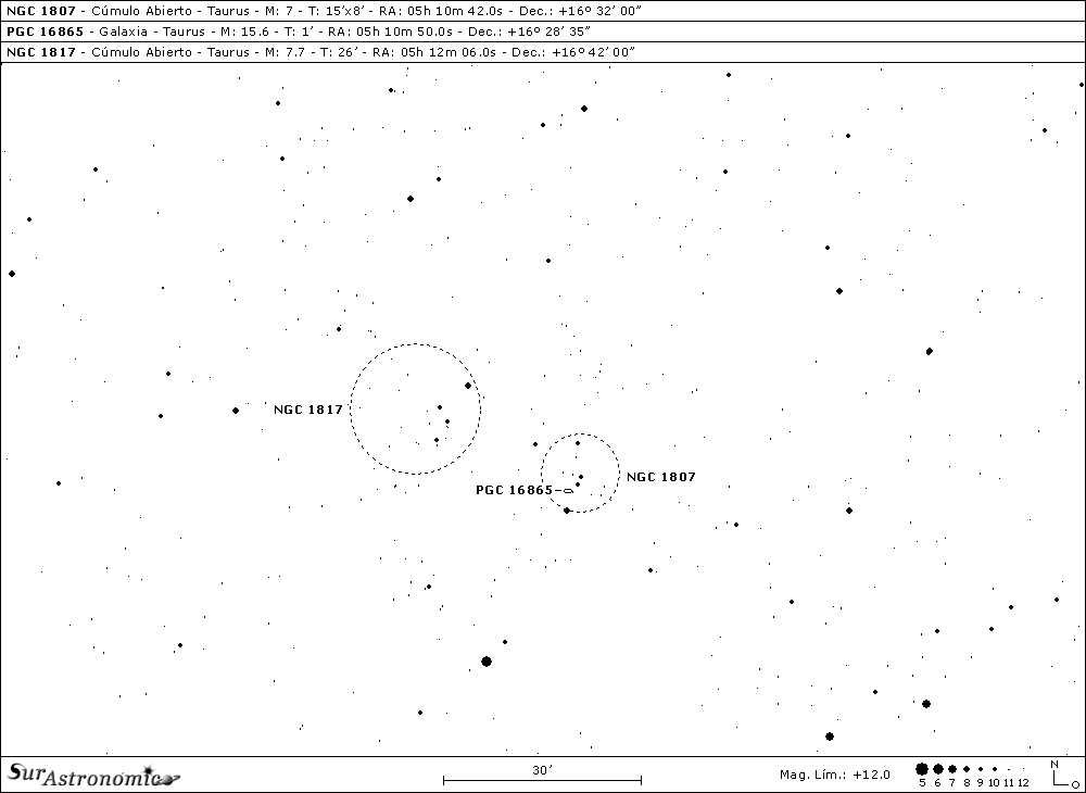 Ya vamos completando la vuelta y, a unos 3,7° al Oeste y un poco al Norte, sobre el poblado campo estelar situado en el borde Sur con la constelación de Orion, a unos 8,5° prácticamente al Este de alfa (α) Tauri, Aldebarán, estudiaremos dos cúmulos galácticos: NGC 1807 y NGC 1817. Podríamos llamar a estos dos objetos como El Doble Cúmulo de Tauro, ya que aparecen muy cercanos visualmente, separados en sus bordes por menos de 10’ de arco, siendo observados al mismo tiempo en un ocular de gran campo ó de baja potencia.