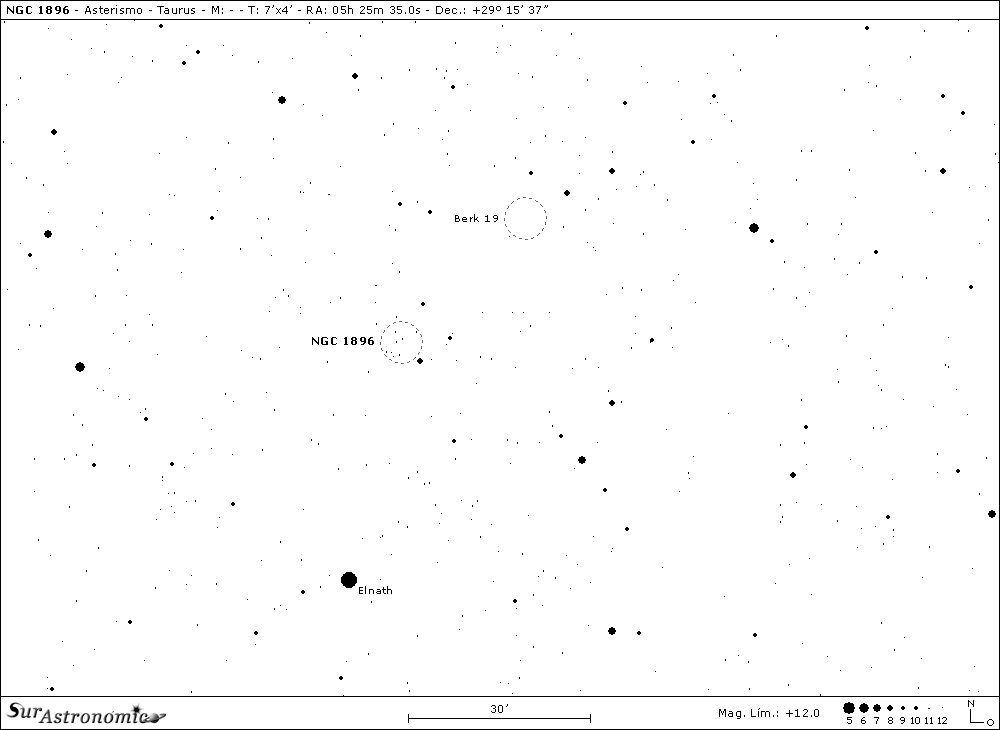 Seguimos con NGC 1896, un asterismo hallado sobre el borde Auriga-Taurus, a solo unos 40’ al Norte y apenas al Oeste de la estrella gigante blanco-azulada, con mag. 1,6, beta (β) Tauri, Elnath ó Alnath, estrella compartida con Auriga, como gamma (γ) Aurigae. Esta luminosa estrella, situada a unos 131 años luz de la Tierra, se formó en el cúmulo M 45, las Pléyades.