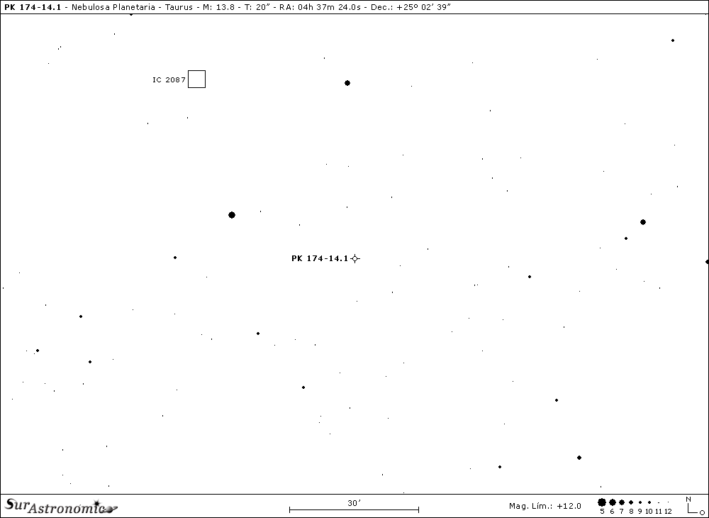 Nuevamente forzaremos la observación con nuestro próximo objeto, PK 174-14.1 una débil nebulosa planetaria, reservada para grandes aperturas, descubierta por el astrónomo estadounidense Ulrich Nicholas Mayall, en el año 1964. Tiene brillo sup. 12,9 y su estrella central es de 18ª magnitud. Nos plantea un gran desafío observacional, siendo un objeto difícil por su bajo brillo, que nos hace recurrir a aperturas de 14", en un cielo oscuro, para discernir algo de su apariencia visualmente. Aparecerá pequeña y redondeada, muy tenue y difusa, logrando la mejor imagen con aumentos intermedios, visión periférica y, aún mejor con un filtro OIII. A bajos aumentos se aprecia muy tenue y fantasmagórica.