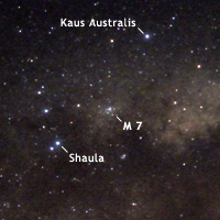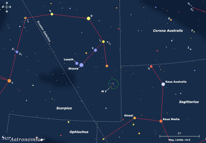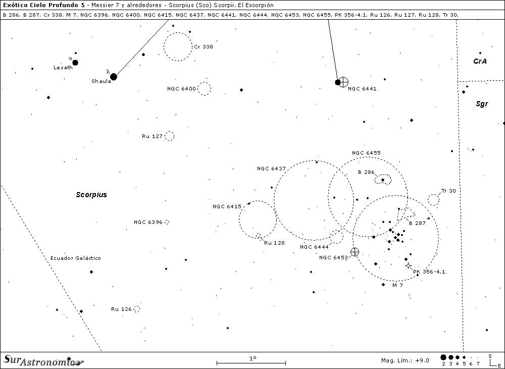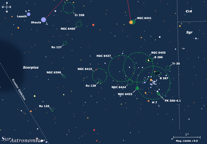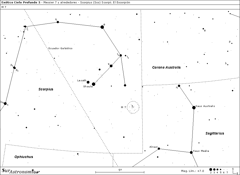 Partiremos desde el gran M 7, un notable cúmulo galáctico de mag. 3,3 y diámetro aparente de 80’, hallado en la zona de la cola del Escorpión, sobre el borde Este con la constelación de Sagittarius, a 2,4º al Nor-Noreste de la estrella gigante, amarillo-anaranjada, de mag. 3,2, G Scorpii ó SAO 209318, la cual marca la punta del aguijón y, a 4,7º al Noreste de la estrella azulada y múltiple, con magnitud 1,6, lambda (λ) Scorpii, Shaula.