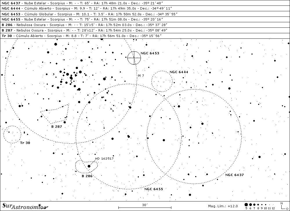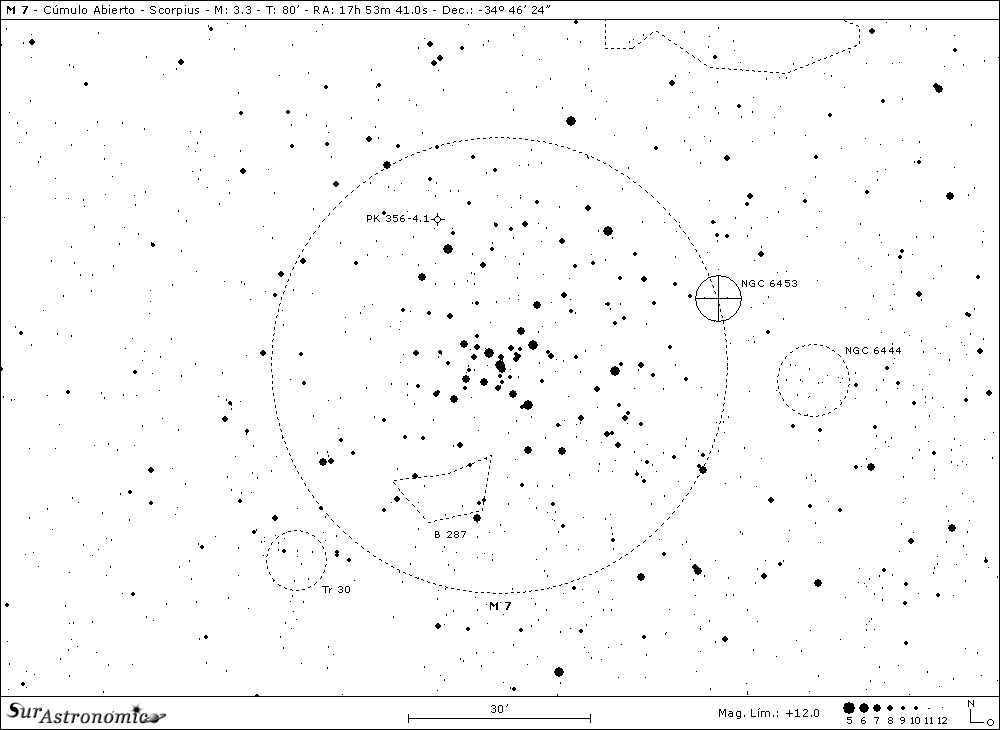 Desde aquí, nos trasladaremos unos 28’ hacia el Este y algo al Sur, hasta el borde Sudeste de M 7, a unos 50’ de su centro y, al Sur de un par estelar, cuya componente más brillante es la estrella blanco-azulada de mag. 7,7, SAO 209500 ó HD 163251, donde encontraremos a Tr 30. Este pequeño y discutido cúmulo abierto, descubierto por el astrónomo de origen suizo R. J. Trümpler, puede pasar desapercibido en pequeñas aperturas y, luce interesante y bonito, desde un sitio oscuro, con aperturas medianas a grandes y más de 80 aumentos, viéndose algo triangular y sin una notoria concentración central. De mag. 8,8, diámetro angular 7’ y clasificación III 2 p, está compuesto por una veintena de estrellas desde la 10ª magnitud. Aún se discute si es un cúmulo independiente o forma parte de M 7.