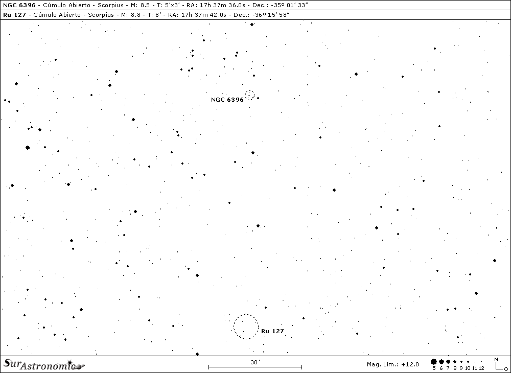 Siguiendo nuestro itinerario, buscaremos al cúmulo abierto NGC 6396, el cual hallaremos a 1,3º al Oeste y ligeramente al Sur de Ru 128, sobre otro poblado campo con estrellas de variado brillo y color. Este interesante grupo, también puede ser localizado, partiendo desde la estrella azulada y múltiple, con magnitud 1,6, lambda (λ) Scorpii, Shaula, a unos 2,2º al Nor-Noreste de ella ó, asimismo desde M 7, a 3,3º directamente al Oeste. Con mag. 8,5, dimensiones aparentes de 5’x3’ y clasificación II 3 m, se encuentra a una distancia del Sol de 4200 años luz. Con una edad aproximada de 25 millones de años, es un joven cúmulo que esta compuesto por unas 80 estrellas con brillos a partir de la 9ª magnitud y, fue descubierto por John Herschel en el año 1836. Erróneamente fue mal posicionado, por pocos minutos de arco, en el NGC, New General Catalogue of Nebulae and Clusters of Stars, de 1888 y, esta falta sigue arrastrándose actualmente en muchos catálogos y softwares astronómicos.