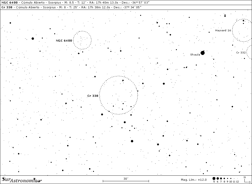El tercer cúmulo cercano a la bella Shaula es Cr 338. Introducido en el año 1937, por el astrónomo sueco Per Collinder, en su catálogo de 431 cúmulos abiertos, esta agrupación clase III 2 p, se halla a aproximadamente 1º al Sudeste de lambda (λ) Scorpii. Su magnitud 8, es engañosa y debida a su posible componente más brillante, la estrella HD 159724, blanca y de mag. 8,5. Compuesto por unas 40 estrellas de brillo dispar, unas 25 hasta la 13ª mag., en un área circular de 25’, es un buen objeto para explorar con pequeñas aperturas y hasta binoculares, desde un lugar oscuro. Al observar la zona con un reflector de 5", veremos muchas estrellas blanco-azuladas y algunas amarillentas, formando pares, tríos y algunas líneas cortas y curvadas, sin mostrar ninguna concentración destacada.