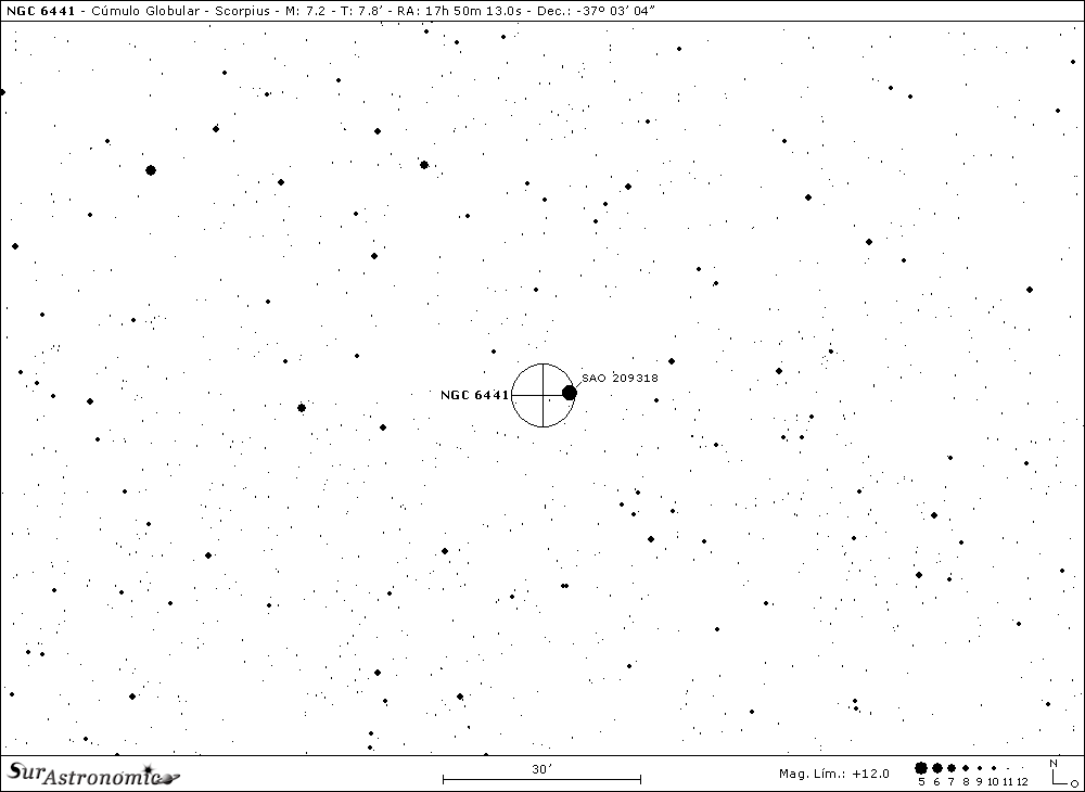 Para nuestra última parada tenemos un cúmulo globular, el cual encontraremos a casi 2,5º al Sud-Sudoeste del cúmulo galáctico M 7, donde comenzamos. NGC 6441 fue descubierto en un telescopio reflector con espejo metálico de especulo de 9" (equivalente hoy en día a un reflector de 6"), por el astrónomo de origen escocés James Dunlop, en el año 1826, desde Parramatta, Nueva Gales del Sur, Australia. Es un masivo globular clase III que puede detectarse, en un cielo oscuro, con un pequeño refractor de 2", donde aparecerá como un pequeño manchón más brillante hacia el centro. Tiene mag. 7,2, diámetro angular 7,8’, un diámetro real de 107 años luz y se encuentra a una distancia del Sol de 36.000 años luz.