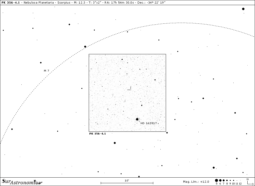 Siguiendo dentro del cúmulo, podemos intentar detectar a PK 356-4.1, una pequeña nebulosa planetaria descubierta fotográficamente en el año 1921, por la gran astrónoma estadounidense Annie J. Cannon. De aspecto estelar y, ubicada visualmente al Noreste del centro de M 7, a unos 5,8’ al Norte y apenas al Este de la estrella blanca SAO 209446 ó HD 162817, de mag. 6,1. Su tamaño aparente es de solo 3"x2", magnitud 12,3 y brillo sup. 5. Es detectable, con dificultad y, una buena carta para no confundirla con una estrella más, con aperturas de 6" en un cielo oscuro y diáfano.