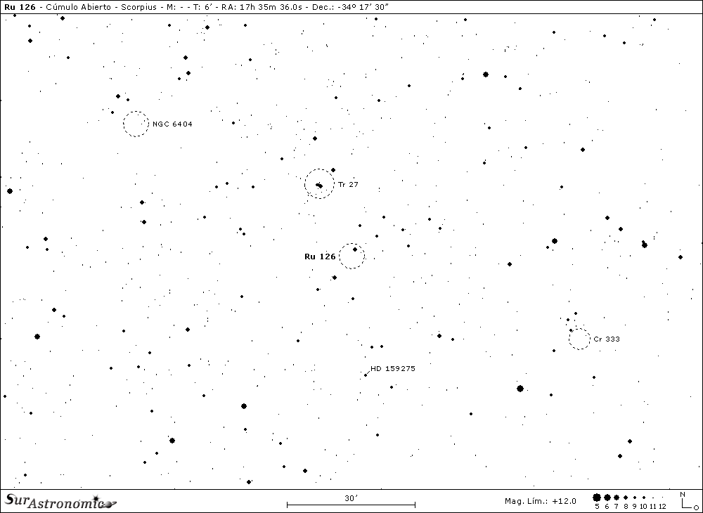 Llegando al borde Noroeste de nuestra área establecida para esta 5ª entrega, a 1º al Nor-Noroeste del cúmulo anterior e insertado en la zona de gran absorción de la nebulosa oscura Barnard 271, hallamos a Ru 126. Este poco interesante cúmulo galáctico ó abierto, de 6’ en diámetro y clase IV 2 p, está reservado para grandes aperturas. Compuesto por una veintena de estrellas débiles, a partir de la 13ª magnitud, al estudiar la zona con un reflector de 12", pasará totalmente inadvertido, destacándose solo tres brillantes estrellas, de 10ª mag., que no pertenecen al objeto, rodeándolo al Sur, al Oeste y al Noreste, esta última, de mag. 9,8 es HD 159275.
