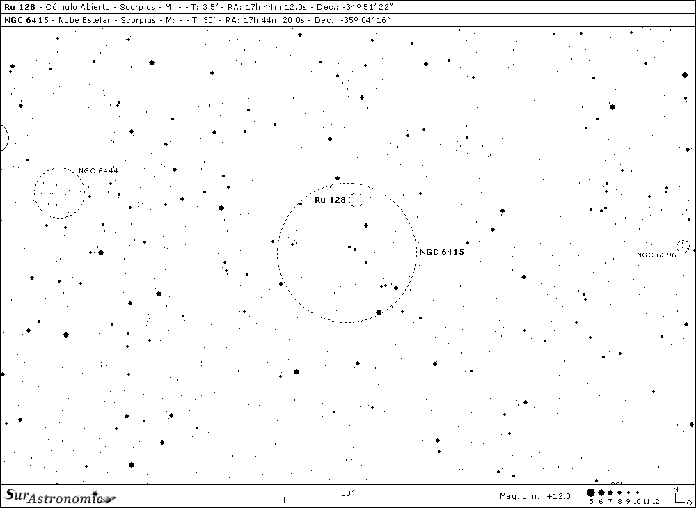 Luego de recrearse con el paseo, retornamos a un desafío, se trata del pequeño cúmulo abierto ó galáctico Ru 128. Clasificado IV 1 p, pasa desapercibido ante el rico campo que está ubicado a casi 2º directamente al Oeste de M 7. Posee unas 45 estrellas, a partir de la 13ª magnitud, en un área circular de solo 3,5’ de arco. Recomendado para aperturas mayores de 14", igualmente podemos intentar su exploración con aperturas menores y, de aquí dirigirnos a 25’ al sudoeste, donde tropezaremos con el centro de otra nube ó condensación estelar, denominada NGC 6415. Fue introducida por James Dunlop en el año 1826 y, como en los casos anteriores, su investigación se hace interesante con pequeñas aperturas y/o prismáticos desde un sitio oscuro.