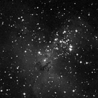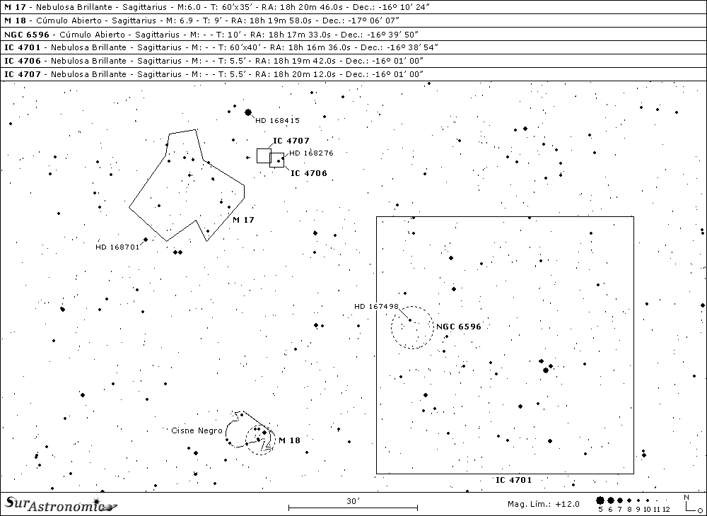 Nuestro primer objetivo, en Sagittarius, es M 18, un pequeño y pobre cúmulo estelar abierto, descubierto por el conocido astrónomo francés Charles Messier en el año 1764. La rica inmediación estelar en donde se halla, hace que pierda cierto interés, por ello no es un objeto muy observado. Clasificado II 3 p n, está compuesto por unas cuarenta estrellas de variada magnitud, entre la 8ª y la 14ª, mayormente blancas y blanco-azuladas y, unas pocas amarillentas, superpuestas a una tenue y ajena zona de nebulosidad, la cual sólo puede apreciarse en fotografías. Tiene mag. 6,9, brillo sup. 12, diámetro aparente 9’, diámetro real 6 años luz. Su edad es de aproximadamente 35 millones de años y se halla a unos 3900 años luz de nuestro astro rey.