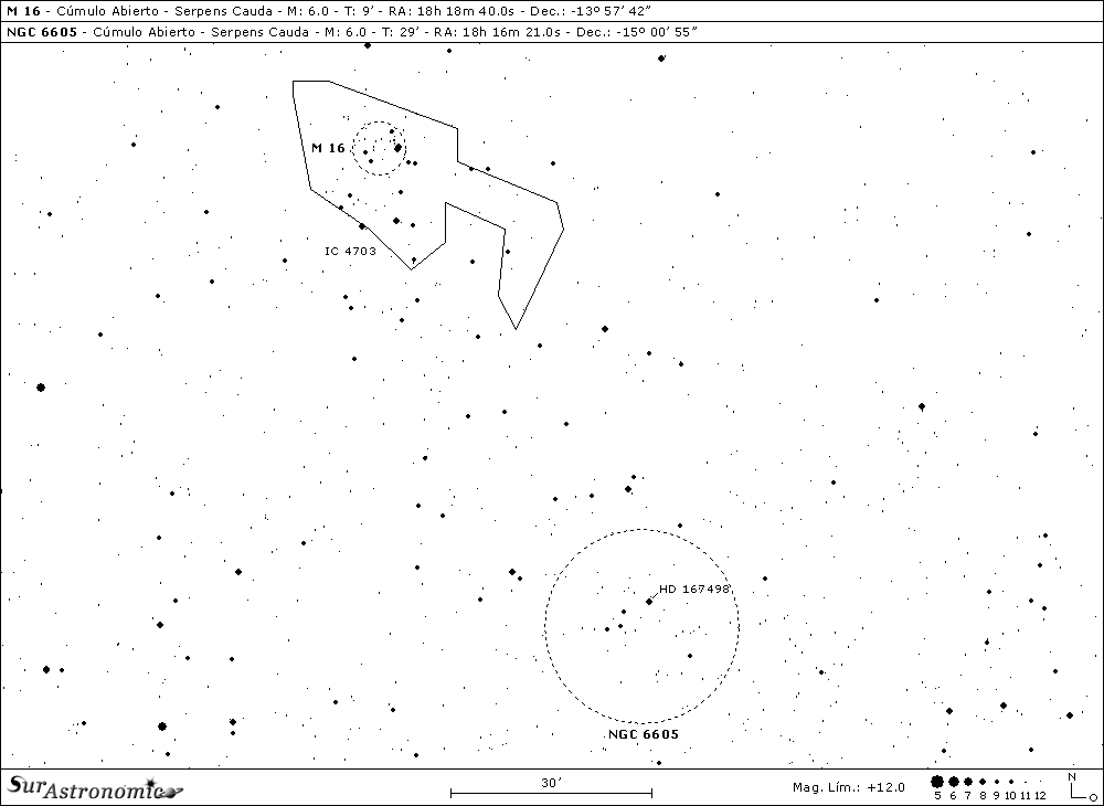 A continuación volveremos a M 17 para, desde allí trasladarnos 1,7º al Noroeste, pasando la frontera Norte para ingresar en la constelación de Serpens Cauda. Allí encontraremos otro desafío, NGC 6605, un confuso y, poco estudiado cúmulo abierto ó galáctico de engañosa 6ª magnitud, pobre, disperso y algo perdido sobre el rico campo de nuestra Vía láctea. Difícil de delimitar y con clasificación incierta, posiblemente III 2 p, fue descubierto por John Herschel y tiene un diámetro aproximado de 29’. Está mal posicionado en la mayoría de los catálogos y softwares astronómicos, donde figura con un pequeño error de 2’ en A.R., situándolo más al Este. La zona comienza a ser interesante con un telescopio de 5", pero costará ubicar el objeto e identificarlo. En un 10", desde un cielo oscuro y diáfano, podremos ver, en el área, varias líneas rectas de estrellas hasta la 13ª magnitud. El grupo está centrado a unos 5’ al Sudoeste de la estrella blanca, con mag. 7,8, SAO 161237 ó HD 167498, por donde podremos apreciar un débil asterismo, compuesto por unas 15 estrellas blanquecinas, de la 9ª a la 13ª mag., formando una letra "Z" invertida, con un diámetro de 6,5’de arco. Las estrellas más brillantes del cúmulo, a partir de la 9ª mag., aparecen concentradas del lado Este.