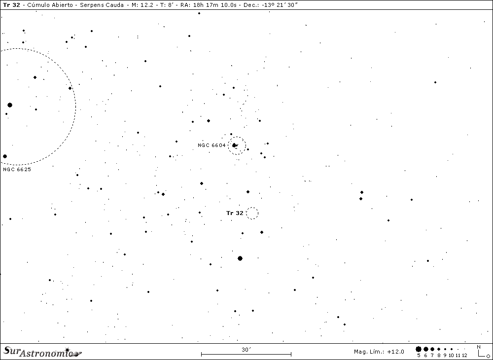 Nuestra última y 7ª detención observacional será Tr 32. Ingresado en el año 1930 por el astrónomo suizo Robert Julius Trümpler, se trata de un pequeño cúmulo galáctico, compuesto por unas sesenta estrellas de variado brillo, con una edad aproximada a 300 millones de años. Con clasificación I 2 m, dista de nosotros 5600 años luz, tiene magnitud 12,2 y diámetro aparente de 8’ de arco.