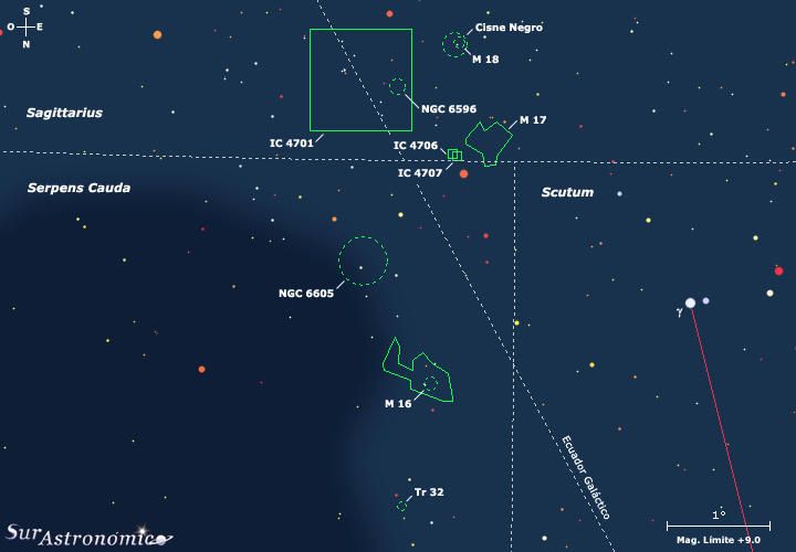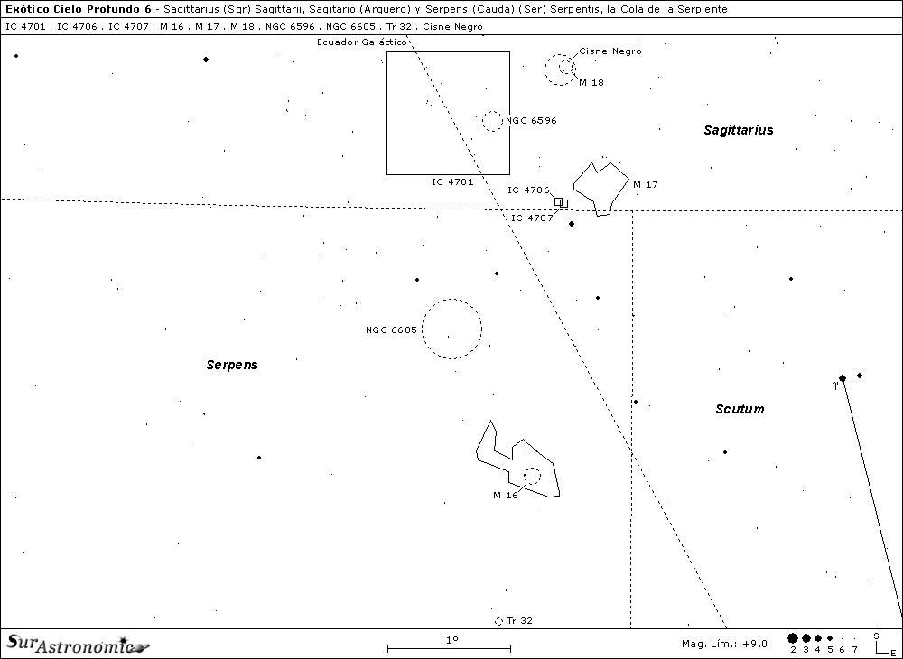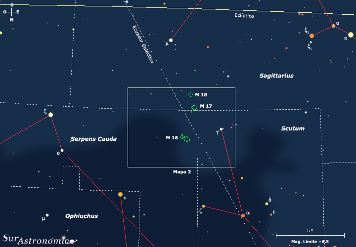 En esta ocasión hemos seleccionado una pequeña zona de 5º cuadrados sobre el borde de las constelaciones de Sagittarius y Serpens Cauda, al Norte del asterismo con forma de tetera de la constelación de Sagittarius y, a solo una docena de grados del centro galáctico. Esta 6ª propuesta observacional tratará de presentarnos un par de magníficas nebulosas en donde se están gestando estrellas y, algunos cúmulos galácticos poco estudiados, todo alojado en el brazo menor de Sagittarius.