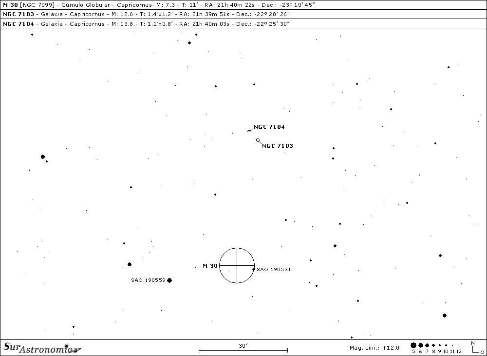 Terminamos esta entrega con dos nuevos desafíos, NGC 7103 y NGC 7104. A unos 45’ al Norte y apenas al Oeste de M 30, dentro de un área de unos 20’ de arco en diámetro, se localiza un lejano y pequeño grupo de galaxias situado a más de 400 millones de años luz, cuyos miembros más brillantes son NGC 7103 y NGC 7104. Ambas galaxias fueron descubiertas por Frank Muller en el año 1886 y, están reservadas para aperturas mayores de 10", aunque pueden detectarse con telescopios de 6" en un cielo oscuro y diáfano.