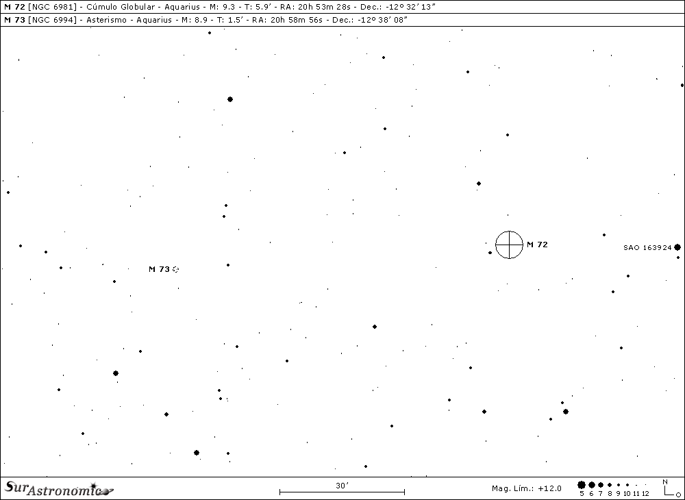 Nuevamente volvemos a M 73 para, desde allí buscar M 72. Messier 72 es un joven, ligero y apagado cúmulo globular, descubierto y descrito como nebulosa débil, a fin de agosto del año 1780 por Pierre Francois Andre Méchain. Para encontrarlo debemos buscar a 1,3º al Oeste y algo al Norte de M 73, cerca de la frontera Sudoeste de Aquarius, que limita con el borde central y Norte de Capricornus, a unos 8º al Este-Noreste de beta (β) Capricorni, Dabih, estrella que forma un interesante sistema múltiple y, a 40’ al Este de la estrella amarillo-anaranjada, de mag. 5,9, SAO 163924 ó HD 198431.