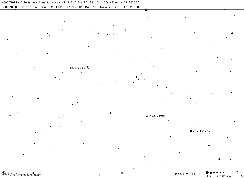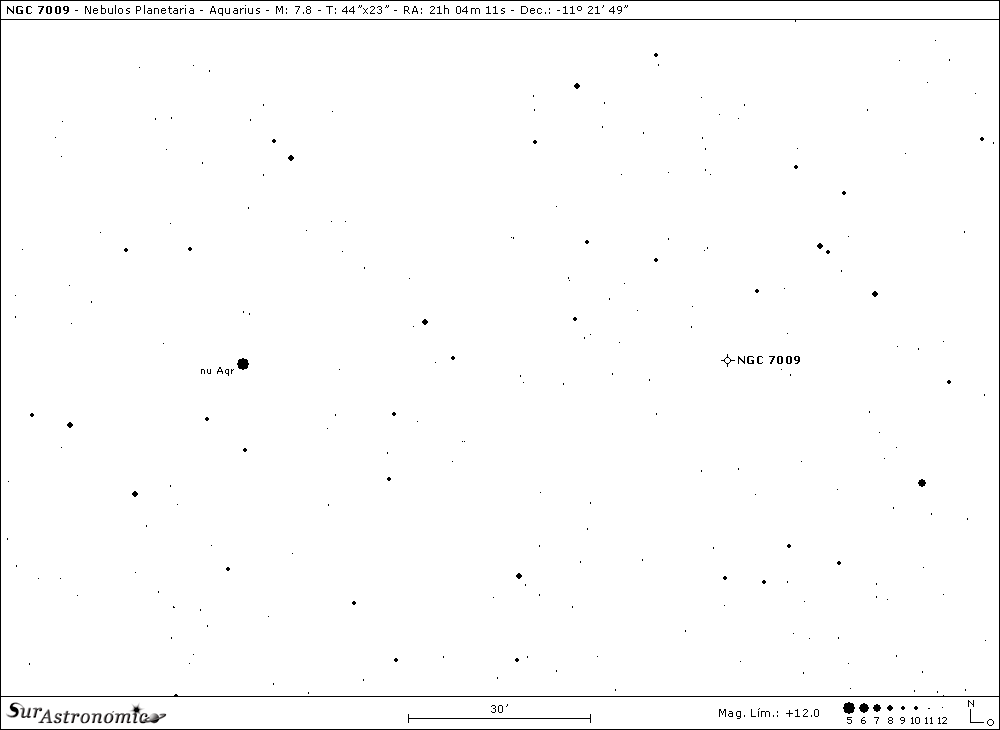 Comenzaremos en Aquarius con, NGC 7009. Sobre un moderado campo estelar, a 1,3º al Oeste de la estrella amarillo-anaranjada, de mag. 4,5, nu (ν) Aquarii, ó 13 Aqr, encontramos esta agradable nebulosa planetaria bautizada por Lord Rosse con el nombre de Saturno, por su singular aspecto, similar al planeta de los anillos. Fue descubierta por W. Herschel el 7 de Septiembre de 1782, tiene mag. 7,8, mag. fot. 8,3 y brillo sup. 6,2. Dimensiones angulares 44"x23", clase IV (VI) y, se halla a una discutida distancia del Sol de entre 1400 y 2500 años luz.