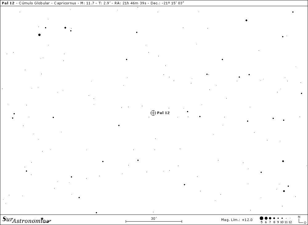 Pal 12 se encuentra sobre un moderado campo estelar, a 2,4º al Noreste de M 30, nuestro próximo objeto.