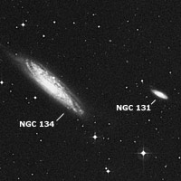 Viéndola tenue y alargada, nos llamará la atención su notorio núcleo en un reflector de 6". Con un 8", aparecerá con bajo brillo superficial, interesante a 100x, elongada 4:1 de noreste a sudoeste, subiendo en brillo hacia el destacado núcleo y, mejorando sus bordes con el uso de la visión lateral ó periférica. En un 12", notaremos mejor sus afilados bordes, dando una imagen bastante romboidal, subiendo en brillo superficial e intuyendo su estructura espiral, con un disco de unos 5,5’x1,3’. La zona central será brillante y su núcleo aparecerá casi estelar. Sobre el borde norte y central, hay una estrella de 13ª mag. y, del lado opuesto, a 1,5’ del centro de la galaxia, otra estrella de brillo similar. Además, muy cerca, hacia el este, noreste y norte, veremos tres estrellas de 11ª y 12ª magnitud. NGC 131 se localiza al oeste de la galaxia anterior y, es una espiral barrada clase SB(s)b:sp, que se nos presenta un con similar ángulo de posición de 63º, regalándonos un agradable efecto visual junto a NGC 134. Con mag. 13,1, mag. fot. 13,7 y brillo sup. 13, tiene un tamaño aparente de 2,1’x0,6’. Hallada a unos 62 millones de años luz, fue descubierta en el año 1834, por John Herschel, desde Sudáfrica.