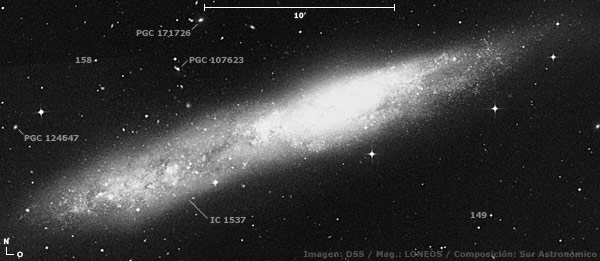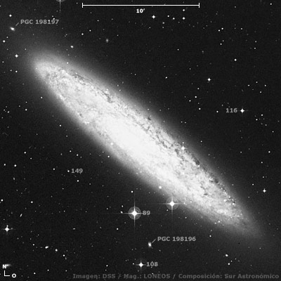 Este maravilloso objeto aparece en un campo con estrellas a partir de la 8ª/9ª mag., contrastando y logrando cierto grado de tridimencionalidad. Entre varias estrellas encontramos: A unos 6’ del centro, al sur y sudsudoeste, una de mag. 8,9 y una de 9,2, respectivamente. A unos 3’ al noroeste del núcleo, sobre el borde de la galaxia, una de mag. 11,3. En el extremo sudoeste, una de 13ª mag. Además, dos superpuestas y dos cercanas a los bordes, de 11ª y 12ª mag., enmarcando su área central.