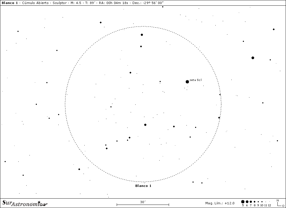 Desde esta interesante galaxia nos movemos hasta el próximo objetivo, el cúmulo galáctico Blanco 1, desplazándonos unos 3º al nornordeste en busca de la estrella azulada zeta (ζ) Sculptoris que, se halla por el centro de la constelación, un poco hacia el noroeste de ésta, a 3,3º al este-sudeste de la estrella doble, blanca y de mag. 5,6, delta (δ) Sculptoris. Este joven cúmulo estelar fue descubierto en el año 1959 por el astrónomo puertorriqueño Víctor Manuel Blanco, quien fuese el segundo director del Observatorio Interamericano de Cerro Tololo, en Chile y por ello, hoy recibe su nombre el gran telescopio de 4 metros. V. Blanco cayó en cuenta que en la zona próxima a la estrella binaria zeta (ζ) Sculptoris había una notoria concentración de estrellas tipo AO, descubriendo finalmente esta agrupación.