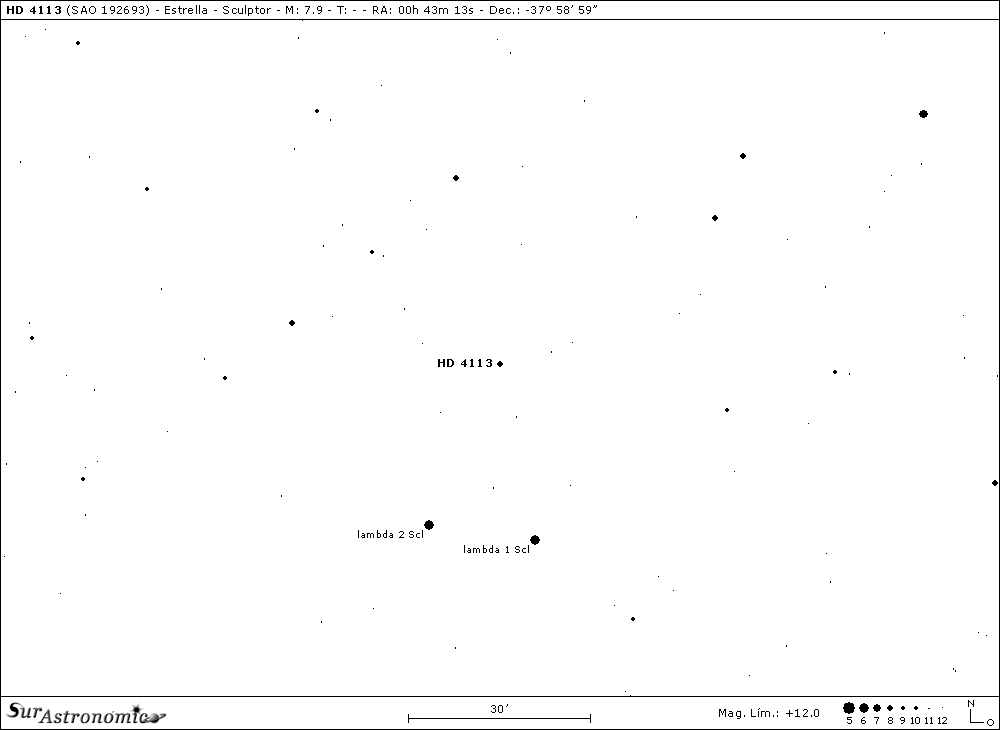 El segundo objetivo, es la primera curiosidad de esta entrega. Ubicada a 2,3º al oeste y apenas al sur de la galaxia anterior, encontramos a HD 4113, una estrella amarilla, de clase espectral G5V, que posee un exoplaneta gaseoso en órbita. Situada a unos 144 años luz del Sol, tiene mag. 7,9, pudiendo observarse con unos simples prismáticos. El planeta extrasolar, llamado HD 4113 b, fue descubierto recientemente, en el año 2007, por un grupo de astrónomos y, por medio del método de velocidad radial. Orbita a su estrella madre en 526 días, a una distancia de 1,38 U. A. y, posee una masa de 1,56 masas jupiterianas.