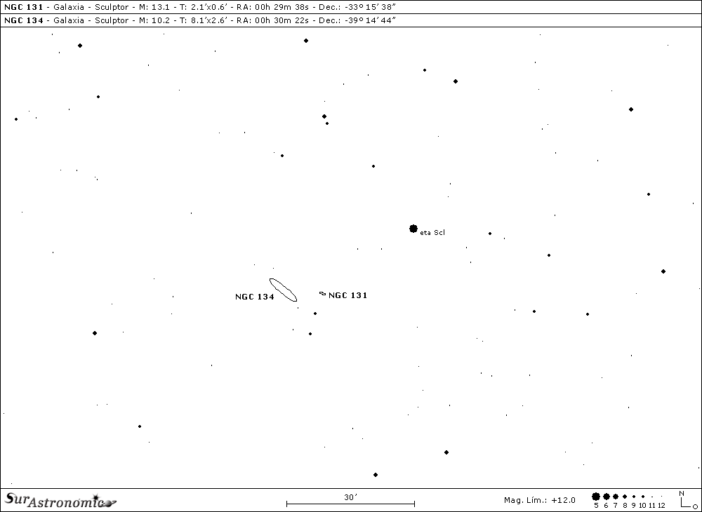 La cuarta parada serán dos galaxias, NGC 131 y NGC 134, ubicadas a 6,7º al nornordeste de NGC 55, por el centro de la constelación, a unos 30’ al sudeste de la estrella anaranjada, variable, de mag. 4,8/4,9, eta (η) Sculptoris y, solo NGC 134 puede llegar a detectarse con binoculares de 7x50, como un pequeño y tenue pálido resplandor, en un cielo oscuro y diáfano. Muy cercanas, separadas por solo 9’ de arco, surgen estas dos galaxias espirales de muy desparejo brillo y tamaño, contrastando con un interesante, poblado y colorido campo estelar.