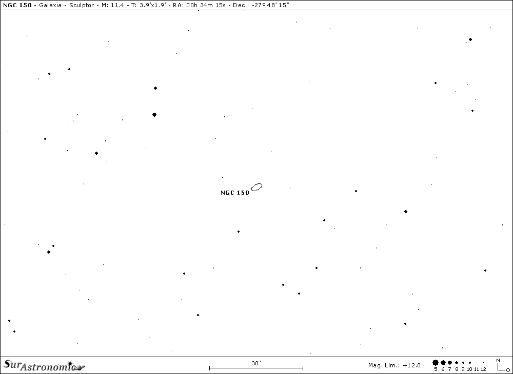 NGC 150 tiene mag. 11,4, mag. fot. 12 y brillo sup. 13,4. Dimensión angular 3,9’x1,9’, AP 118º y, dista de nosotros 62,5 millones de años luz.