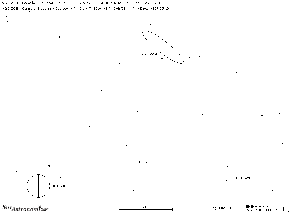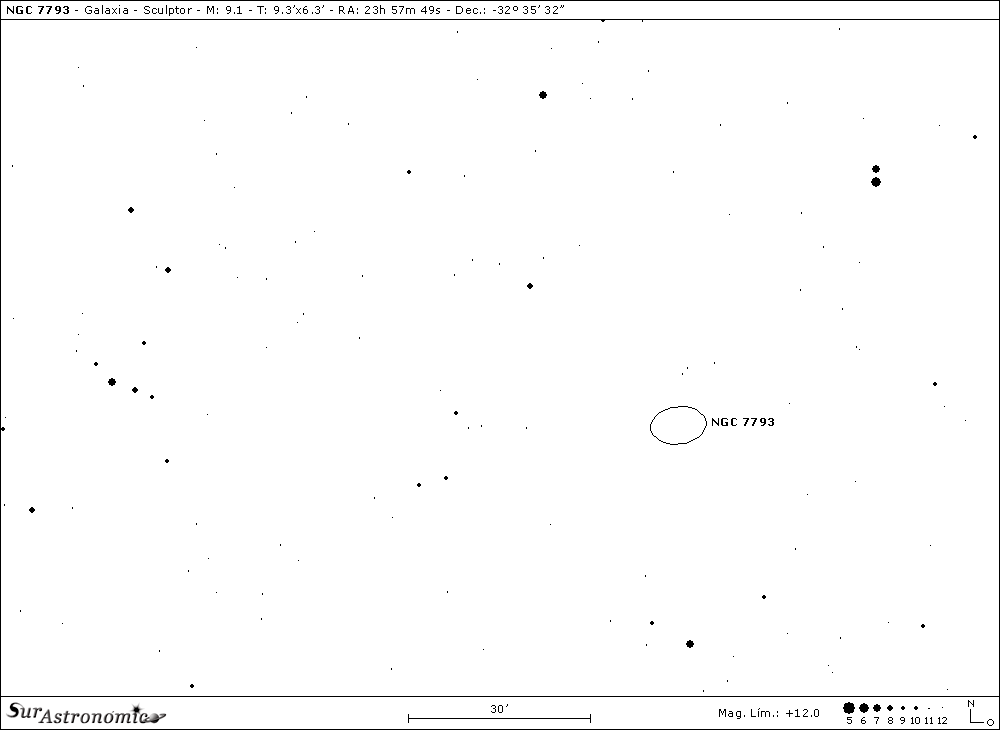 A continuación volvemos al sur, hasta la SDEG y, de allí al oeste, hasta NGC 134 y NGC 131 para, desde allí dirigirnos hacia NGC 7793, la cual encontraremos a 6,6º al oeste y medio grado al norte. Se trata de una galaxia espiral compacta, clasificada por Gerard de Vaucouleurs como SA(s)dm. Descubierta por el astrónomo escocés James Dunlop en el año 1826, con un telescopio reflector de 9", con espejo metálico de especulo, de rendimiento similar a un 6" actual y, luego también descubierta independientemente, por el astrónomo norteamericano George Phillips Bond en 1850, con un telescopio refractor busca cometas de 4" f/8.