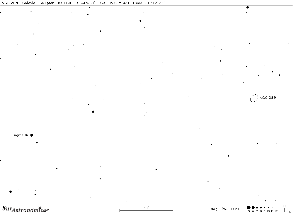 Nuestra sexta perada será NGC 289, una galaxia descubierta por gran astrónomo inglés John Herschel, con el reflector de 18,7" y en el año 1834. Es una gigante espiral barrada con clasificación de Hubble-G. de Vaucouleurs SB(rs)bc, de pequeña barra, bajo brillo superficial y una rica extensión gaseosa de un radio de más de 200000 años luz. En imágenes fotográficas sorprende el extenso halo formado por muy débiles y largos brazos rodeando su centro.