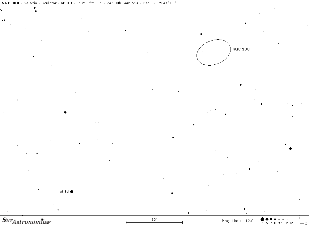 Nuestro punto de partida será al Sur de la constelación, donde estudiaremos a NGC 300. Esta bonita galaxia espiral, clase SA(s)d, es miembro del Grupo del Polo Galáctico Sur y, fue descubierta por J. Dunlop en el año 1826, unos 8 años antes que J. Herschel también la descubriese independientemente. Con mag. 8,1 y mag. fot. 8,7, posee un gran tamaño aparente de 21,7’x15,7’, que explica su bajo brillo superficial de 14,8. Nos exhibe su carácter con un AP de 111º, como vista desde "arriba" y, por su aspecto se dice que es la versión sureña de M 33, en Triangulum. Su diámetro real sería menor de 35.000 años luz y, se hallaría como NGC 55, en el borde del grupo que se encuentra más próximo a la Vía Láctea, siendo su distancia al Sol de algo más de 4 millones de años luz.