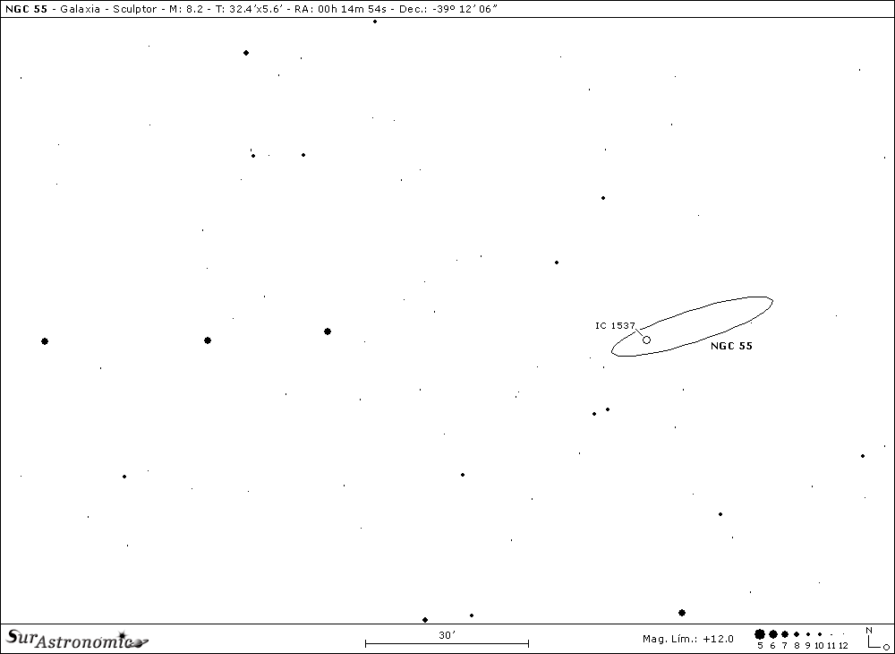 Desde aquí, saltamos 5,7º al oeste-sudoeste en busca de otra interesante galaxia, NGC 55. También del Grupo del Polo Galáctico Sur, es una espiral barrada irregular, tipo magallánica, clase SB(s)m:sp que, se encuentra, como NGC 300, en el borde del grupo más cercano a nuestro Grupo Local, a una distancia de algo más de 4 millones de años luz.