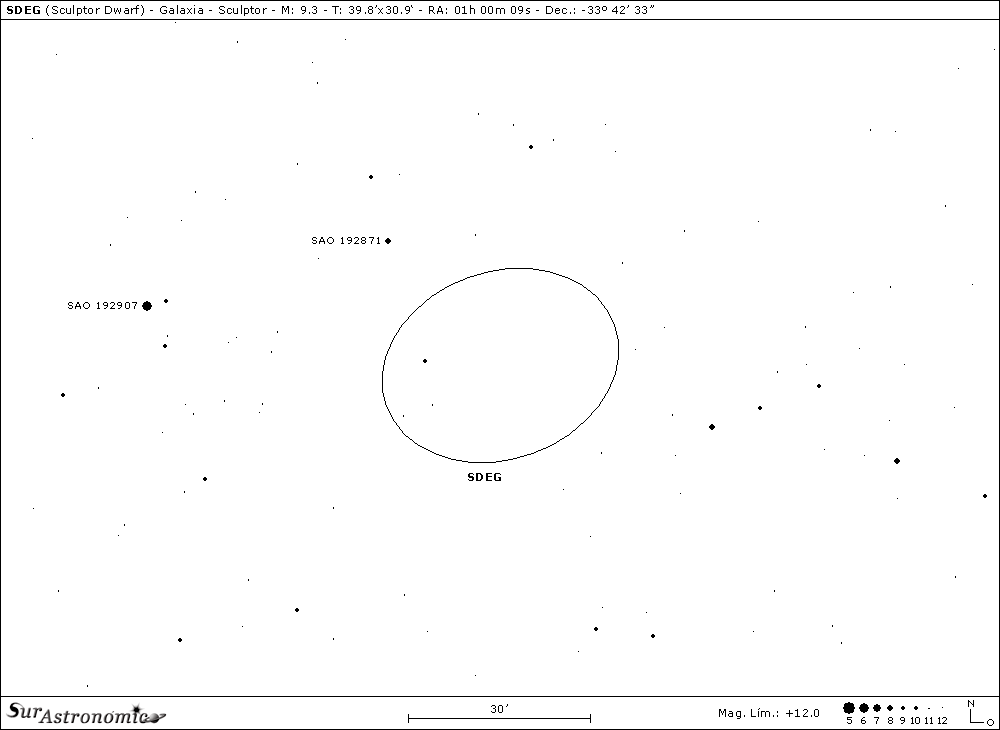Desde este par de galaxias nos moveremos unos 6,2º directamente al este y apenas al sur, para localizar un singular objeto denominado SDEG. La Sculptor Dwarf Elliptical Galaxy ó, Galaxia Enana Elíptica ó Esferoidal de Sculptor, fue descubierta en el año 1938 por el gran astrónomo norteamericano Harlow Shapley, mediante el estudio de las placas fotográficas tomadas un tiempo antes desde la estación astronómica de la Universidad de Harvard, en el Observatorio Boyden, Sudáfrica. Clasificada DE3pec, es la primera galaxia en su tipo descubierta, siendo un miembro más de nuestro Grupo Local y, satélite de la Vía Láctea. Con una discutida magnitud integrada de 9,2 y un gran tamaño aparente de 39,8’x30,9’, posee un muy bajo brillo superficial de 16,7 y, se nos presenta con un ángulo de posición de 110º. Sus estrellas componentes más brillantes son de 18ª magnitud y, se encuentra a una distancia del Sol de 285000 años luz.