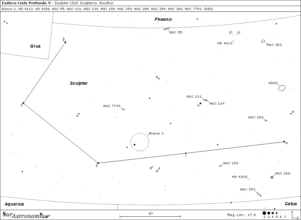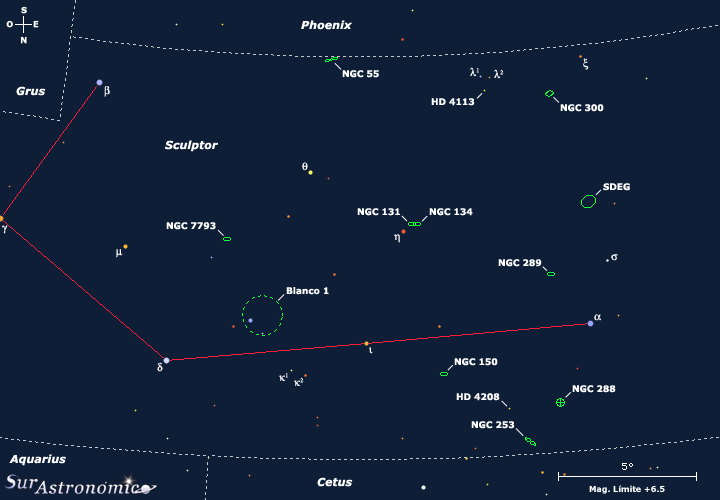 El comienzo de la primavera austral es una gran ocasión para explorar algunos magníficos objetos de Sculptor, constelación creada en el año 1752 por el astrónomo rumano-francés Nicolai-Ludovici De La Caille, más conocido como Nicolás-Louis de Lacaille. Dentro de sus límites encontramos a, la mayoría de una veintena de galaxias, del tipo tardío, de un cercano (el más próximo al Grupo Local) y pequeño grupo, bautizado en 1959 por el astrónomo francés G. de Vaucouleurs como Grupo de Sculptor y, en 1960 por el astrónomo argentino J. L. Sérsic, Grupo del Polo Sur Galáctico, debido a que sus miembros se localizan agrupados en dirección al Polo Sur Galáctico. De este sugestivo grupo elegimos algunas hermosas galaxias que, estudiaremos junto a otros interesantes objetos más, como el cúmulo globular NGC 288, el cúmulo abierto Blanco 1, otras galaxias lejanas y, como curiosidad ya que no es habitual en la sección, veremos un par de brillantes estrellas con exoplanetas.