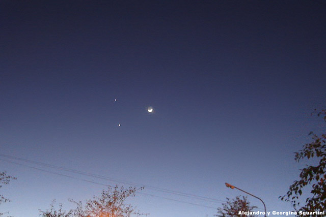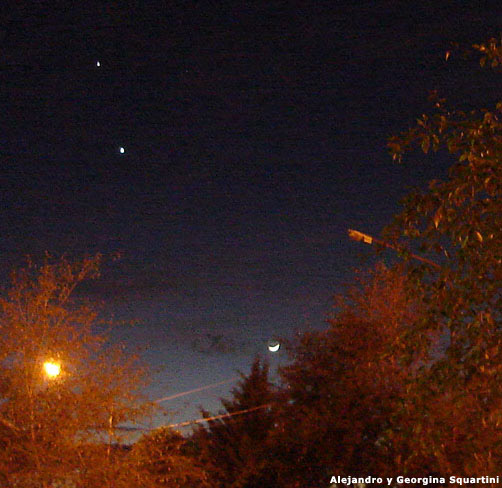 Fotografías de Alejandro y Georgina Squartini de la conjunción entre la Luna, Venus y Júpiter, tomadas desde la ciudad de Malargüe, provincia de Mendoza, utilizando una cámara digital.