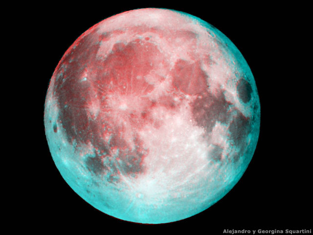 Toma de la Luna en 3D creada gracias a la colaboración con el Club de Astrofísica de Paraguay y compuesta en parte por una imágen tomada desde la ciudad de Malagüe (Mendoza, Argentina) Es necesario usar lentes 3D rojo/azul para apreciarla.