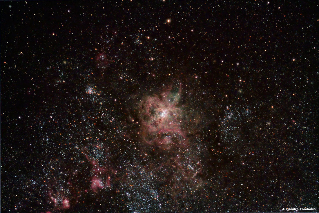 Fotografía de la Nebulosa de la Tarántula, tomada con un telescopio William Optics 132 FLT F/7 utilizando una cámara digital Canon 350D Filtro Type I en 3 tomas de 180 segundos a ISO-800. Guiado con SBIG 402 y Orion 100 mm. Procesado por Marcelo Salemme utilizando PixInsight LE.