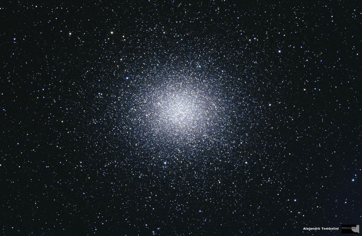 Fotografía del cúmulo globular Omega Centauri, fotografiado con un telescopio William Optics 132 FLT - Longitud focal 925 mm - f/7 en 9 tomas de 120 segundos con cámara Canon 350 Digital Rebel - Filtro Type I, guiado con un telescopio Orion 100 mm y cámara CCD SBIG 402. Imagen en tamaño completo disponible en la galería de Próxima Sur.