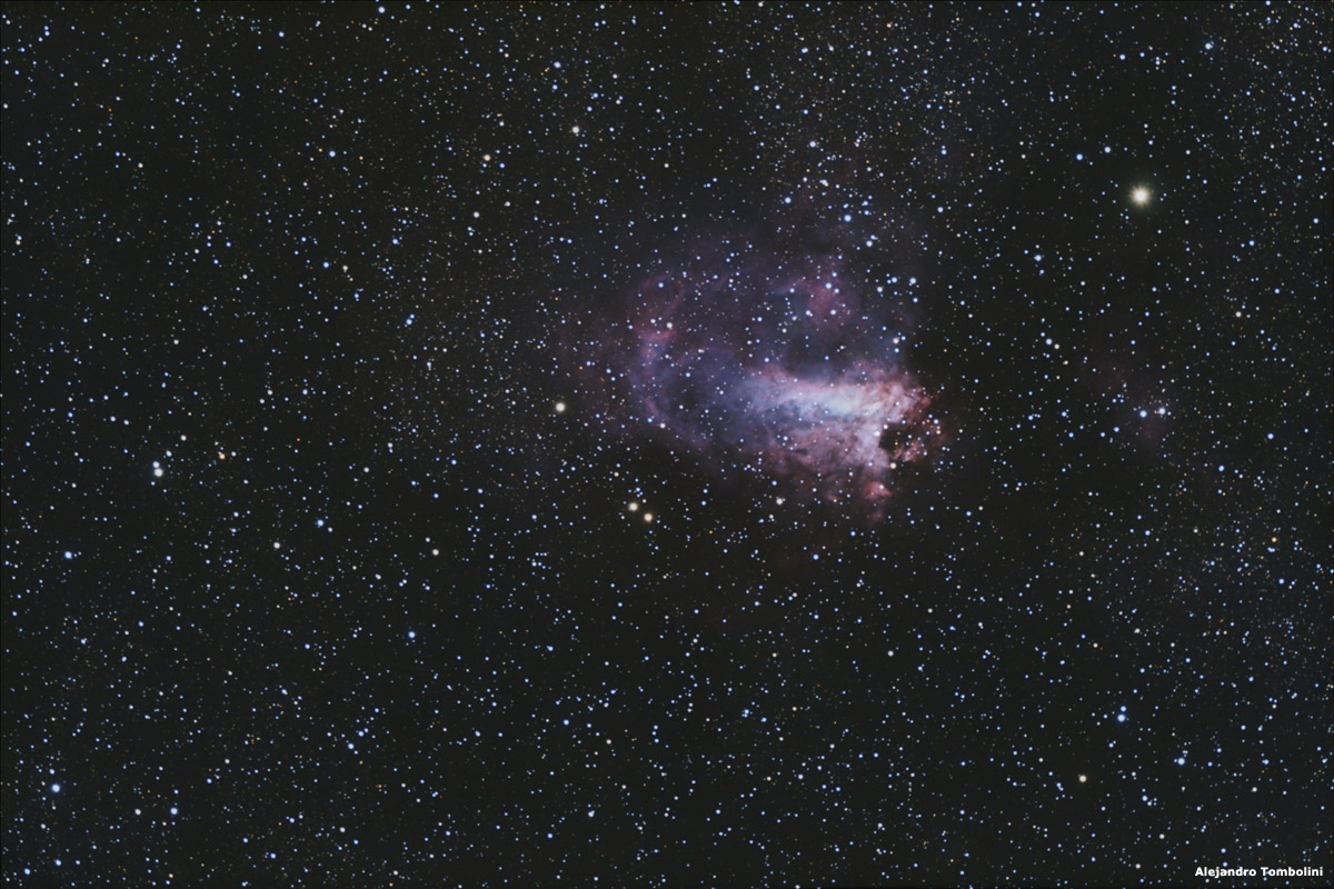 Imagen de la Nebulosa Omega (M 17) y la galaxia M 83, fotografiadas con un telescopio refractor William Optics 132 FLT (f = 925 mm, F/7) y cámara Canon EOS 400 Digital Rebel XTI, guiadas con un telescopio Orion de 100 mm y cámara ST-402, desde la localidad de Trenel, provincia de La Pampa. Imagen de alta resolución disponible en la Galería Próxima Sur.