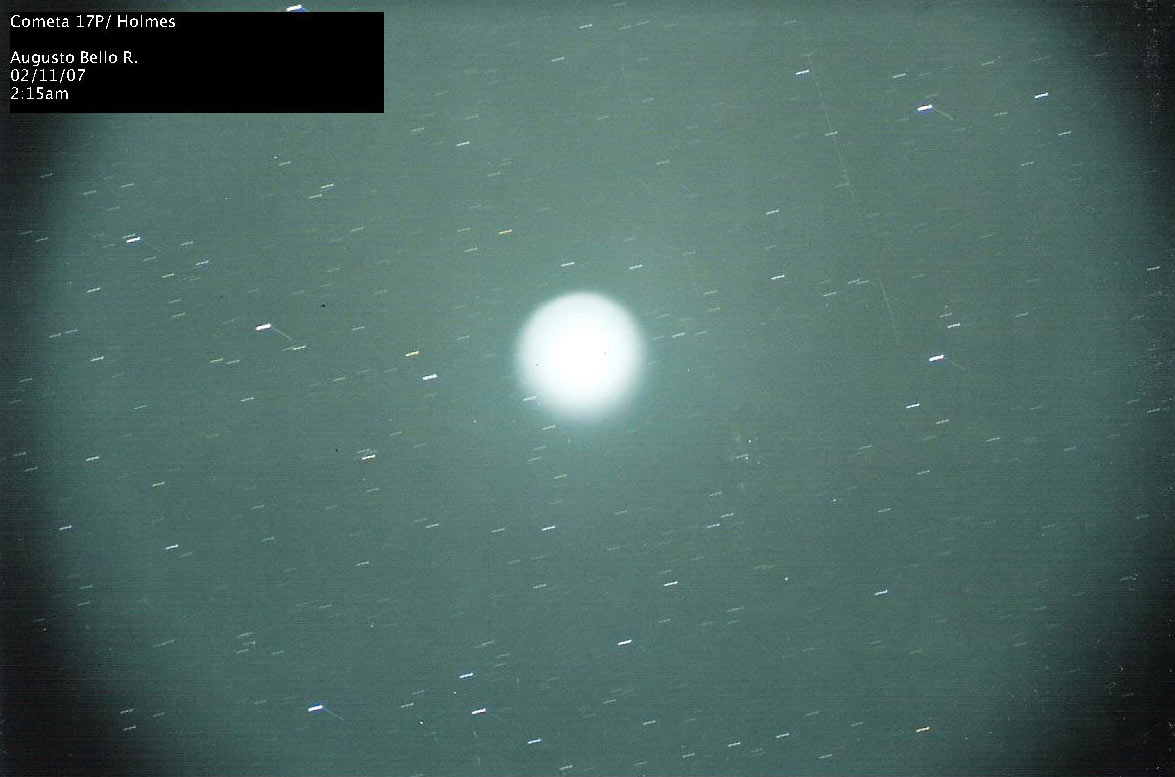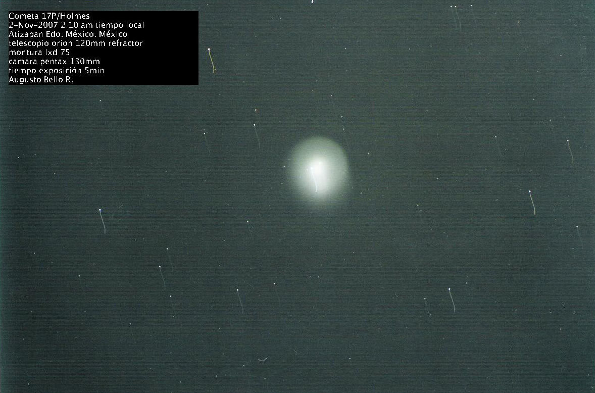 Imágenes del cometa 17P/Holmes tomadas por Augusto Bello desde la Ciudad de México, con una cámara Pentax 130 mm, utilizando un telescopio de 120 mm de apertura y 1000 de focal.