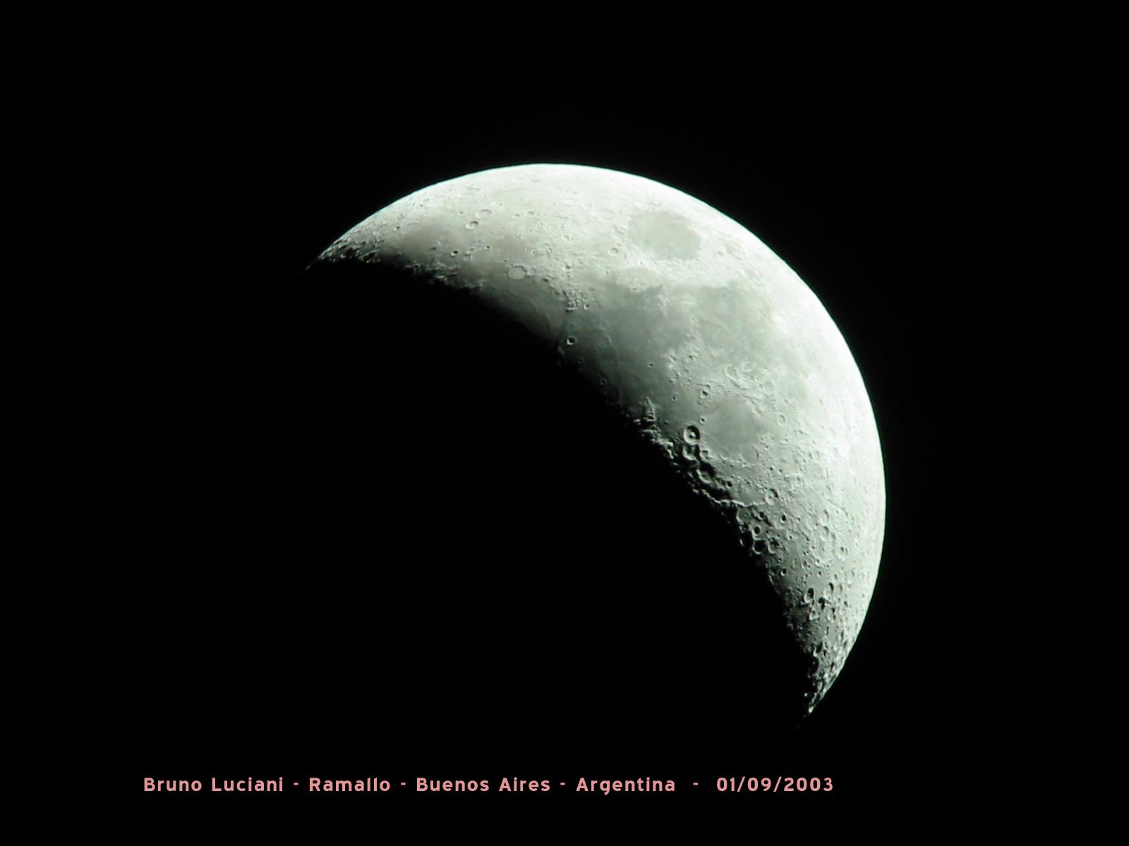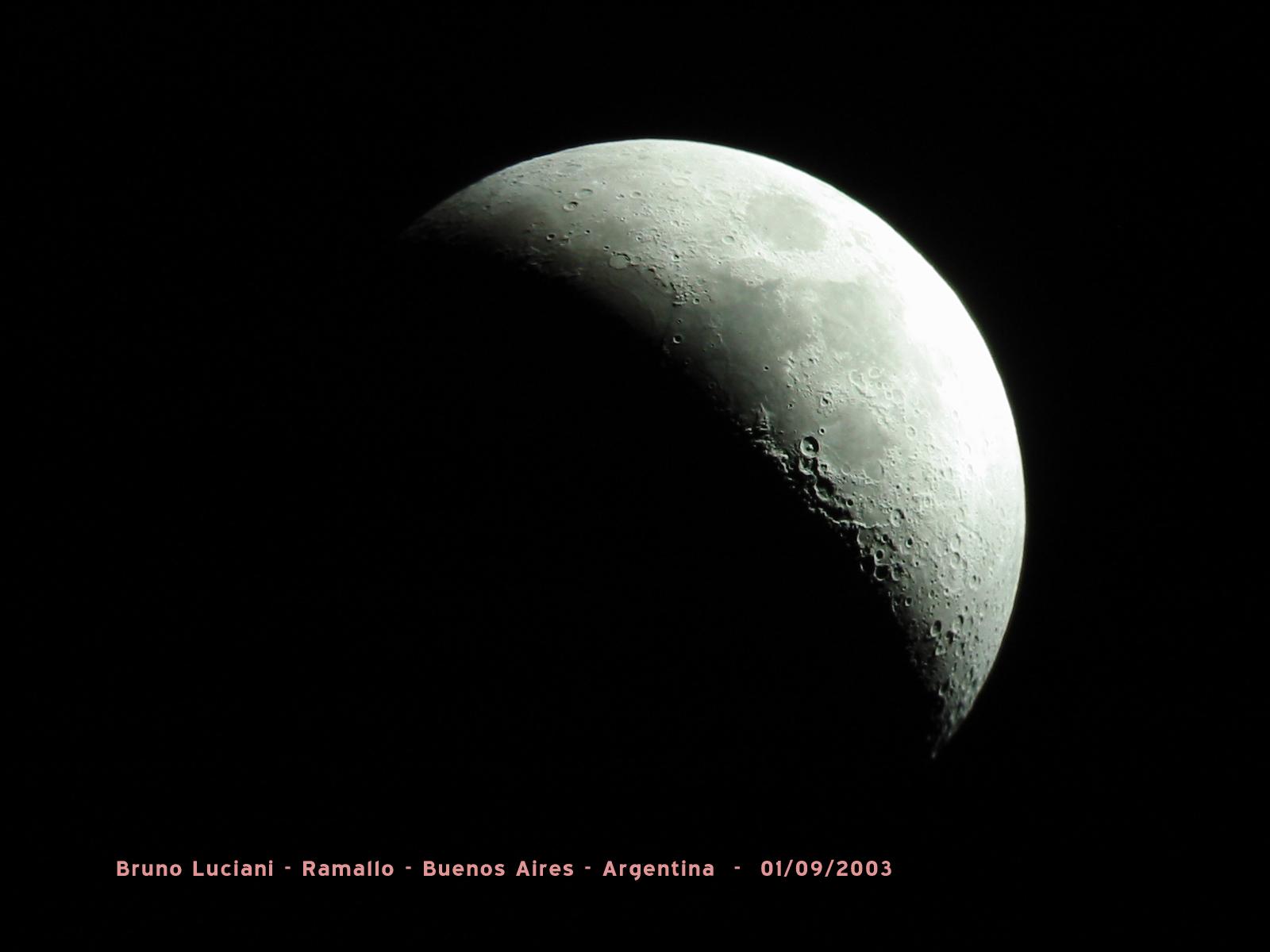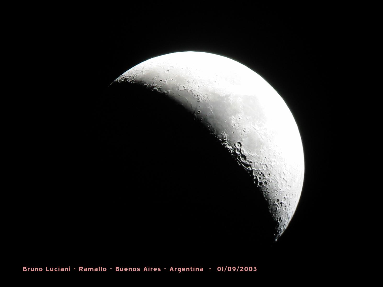 Bruno Luciani nos envía desde Ramallo (Buenos Aires) sus fotografías lunares, tomadas el día 01/09/2003 con una cámara digital Canon Powershot S300 2.1 Megapixel utilizando un telescopio Hokenn H114900-HQ2, un ocular de 32mm Super Plossl y un Barlow acromático 2X.