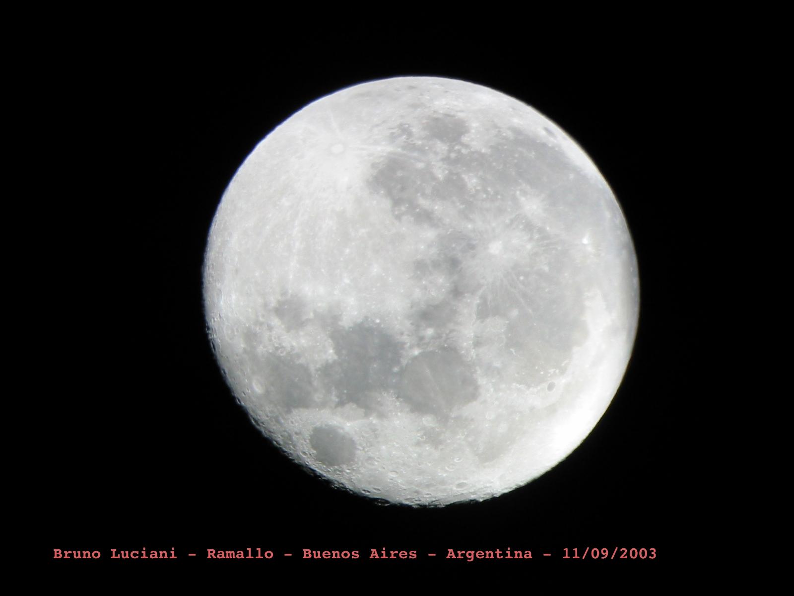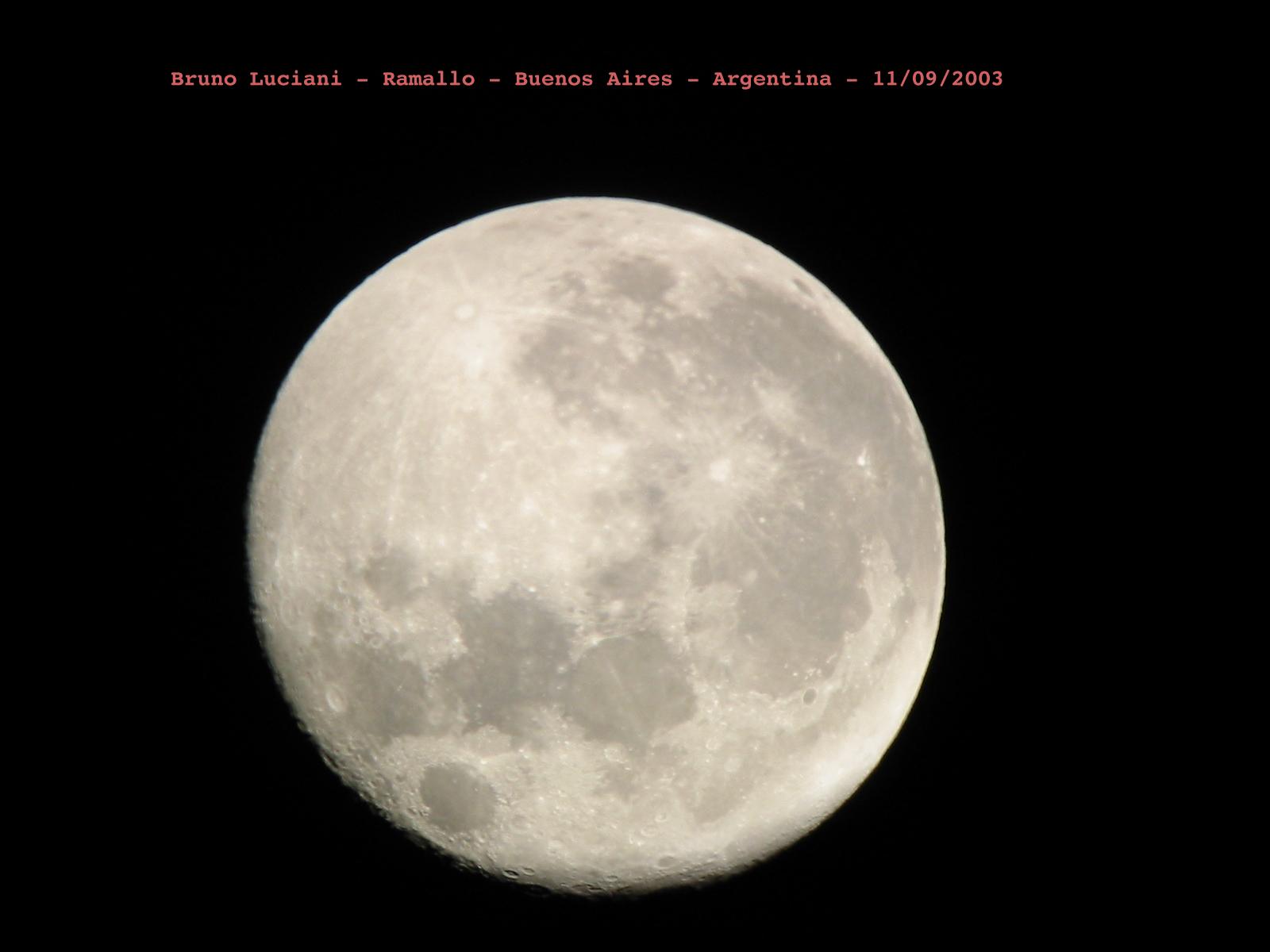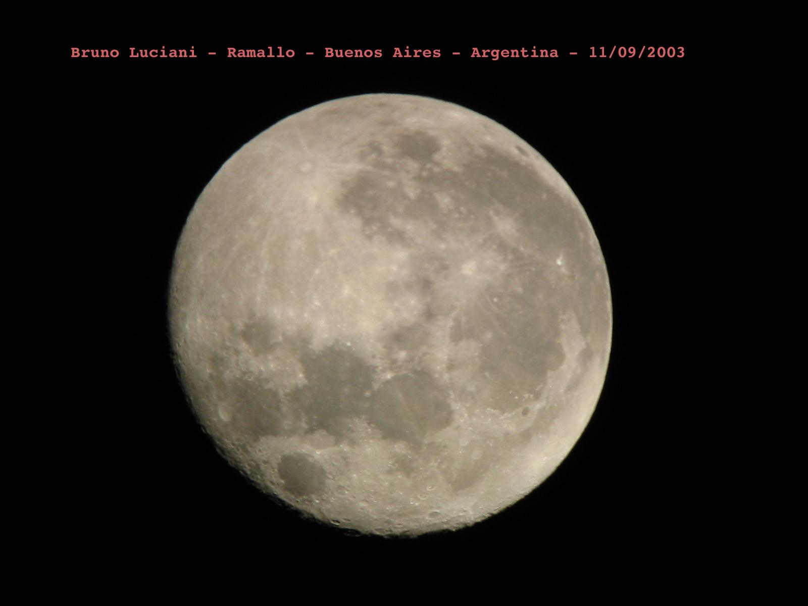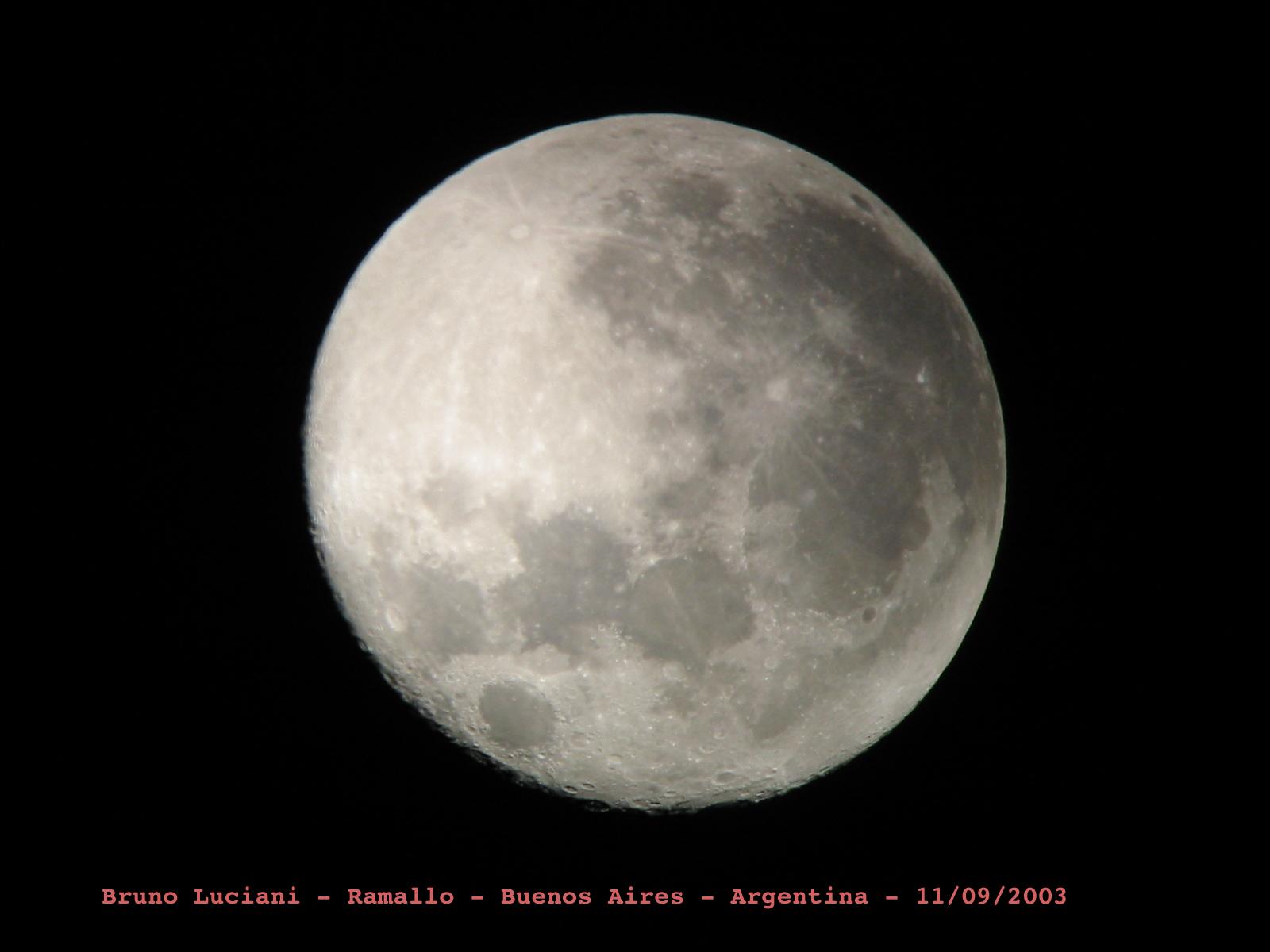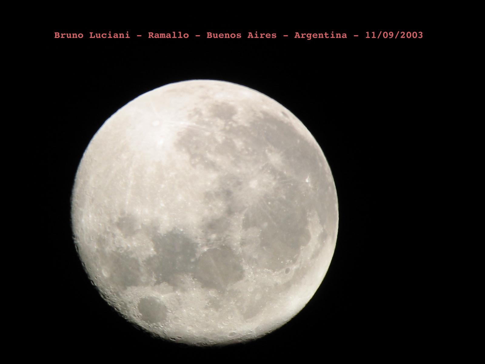 Bruno Luciani nos envía desde Ramallo (Buenos Aires) sus fotografías lunares, tomadas el día 01/09/2003 con una cámara digital Canon Powershot S300 2.1 Megapixel utilizando un telescopio Hokenn H114900-HQ2, un ocular de 32mm Super Plossl y un Barlow acromático 2X.