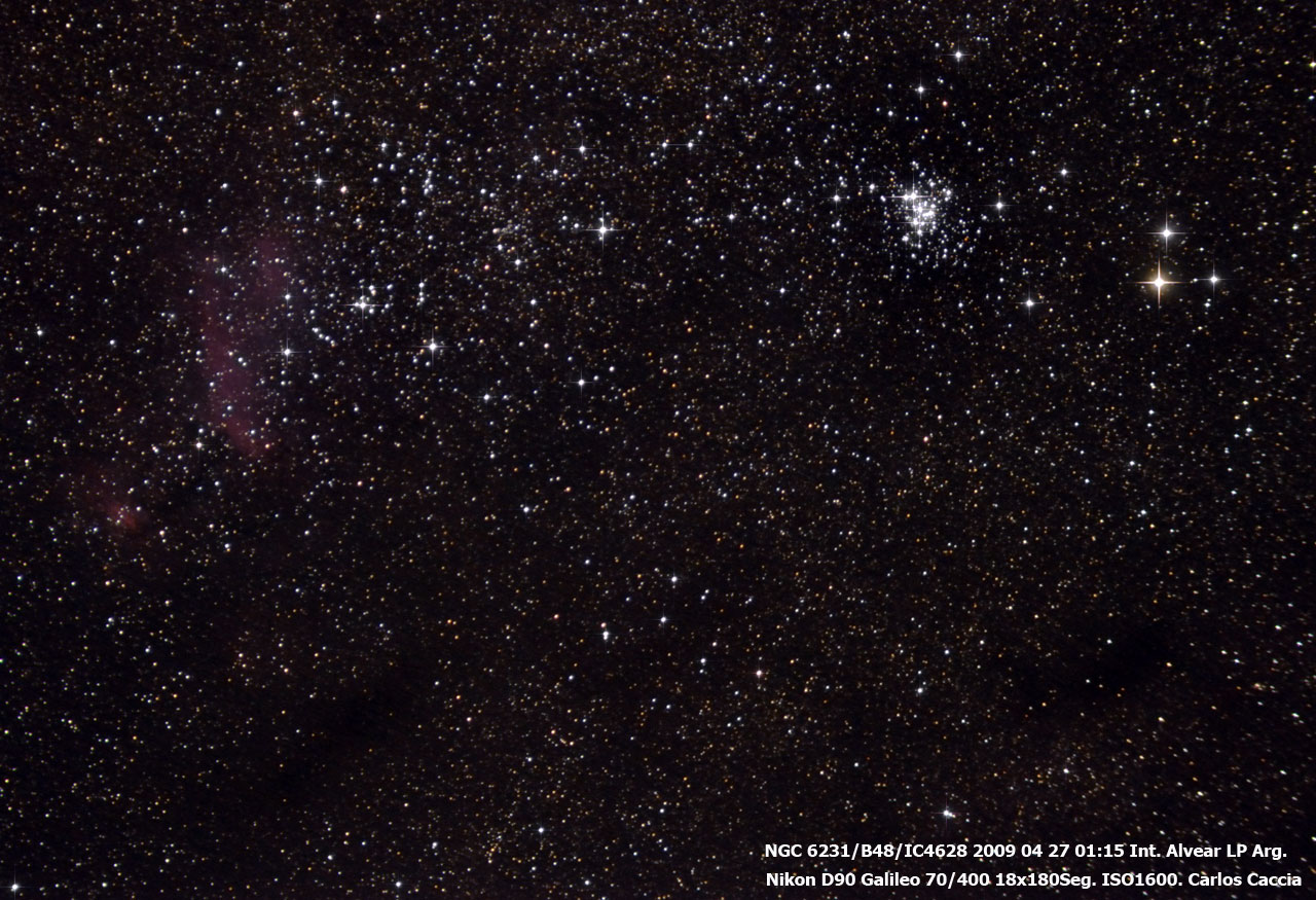 Imagen de NGC 6231, B48 e IC 4628 tomada desde Intendente Alvear tomada a foco primario con un telescopio Galileo 70/400 guiado con telescopio Meade SN 6" con cámara DSI y Envisage. Compuesta por 18 tomas de 180 segundos a ISO 1600 con cámara Nikon D90. Apilado con DeepSkyStacker, curvas y niveles con Photoshop.