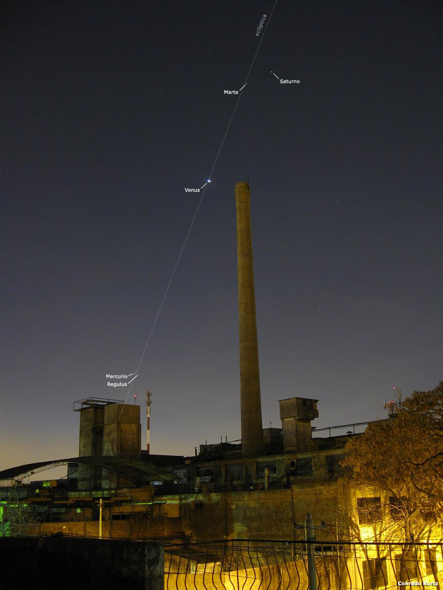 Tomadas con una cámara Canon Powershot A590 IS, muestran la alineación de planetas del 27 de Julio de 2010, con Mercurio junto a Regulus, Venus, Marte y Saturno, dibujando la eclíptica sobre el cielo.
