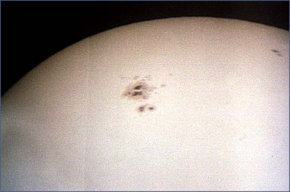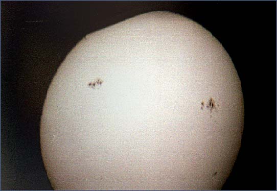 El Sol fotografiado el 25/10/2003 por Conrado Federico Kurtz desde Buenos Aires utilizando la técnica de proyeción por ocular. Pueden verse varios grupos de manchas solares sobre la superficie de la estrella.