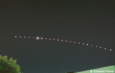 Fotografías enviadas por Eduardo Pulver desde San Pedro, Buenos Aires. La primera es una multiexposición tomada con un objetivo de 300 mm F/5.6. Tiempos de exposición 1/250 (01:58 UT), 4 seg (03:04 UT) y 1/250 (04:10 UT) con una cámara Canon EOS 50. La segunda fotografía se tomó con un objetivo de 28mm F/4.0 a intervalos de 10 minutos, tiempos de exposición en seg : 1/500, 1/500, 1/250, 1/250, 1/125, 1/2, 1, 2, 2, 4, 8, 8 ,8, 4, 2, 2, 1, 1/2, 1/125, 1/250, 1/250, 1/500, 1/500. Cámara Canon AE1.