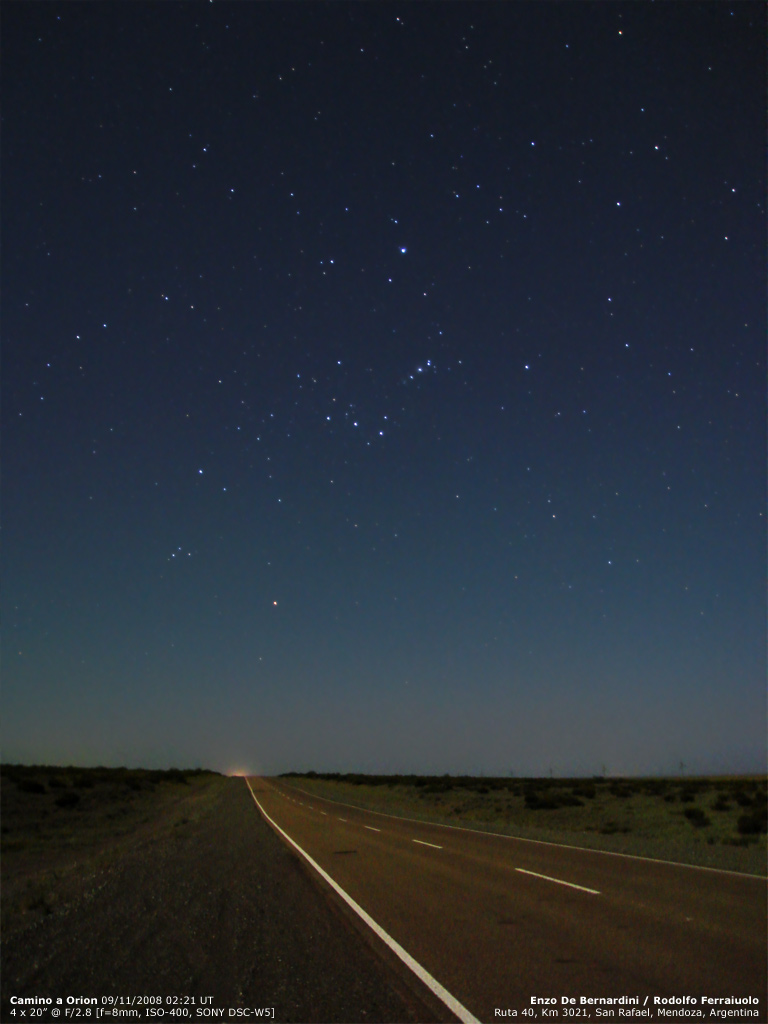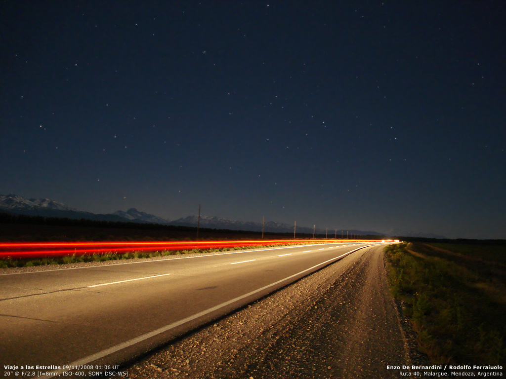 Astrofotografías de campo amplio tomadas desde la provincia de Mendoza, Argentina, utilizando una cámara digital SONY DSC-W5 fija sobre un trípode. La luz de la Luna iluminaba el paisaje y el camino. Las tomas fueron realizadas sobre la Ruta 40, entre Malargüe y San Rafael, con la Cordillera de los Andes como fondo. La adquisición de las imágenes fue posible gracias a Rodolfo Ferraiuolo.